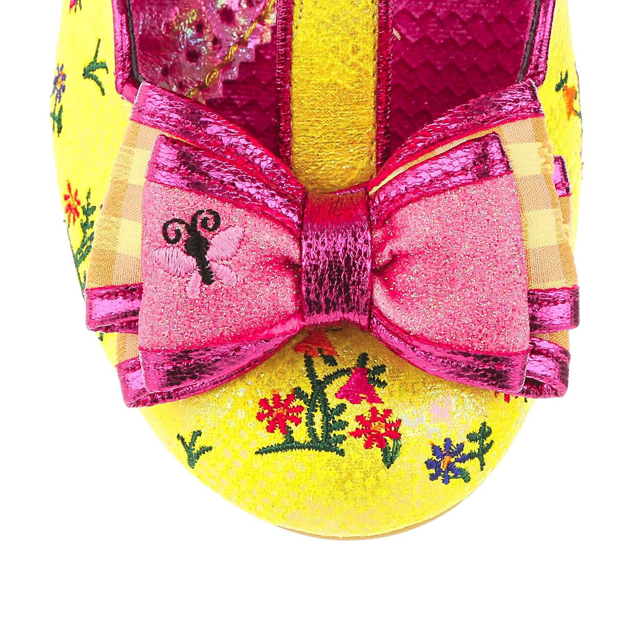 A whimsical wonder, these adorable T-Bar mid heels are a little breath of fresh air for your wardrobe! A fabulous yellow colour is embellished with tiny little embroidered posies, which is bordered by the scalloped edges with wrap around the whole shoe! A T-Bar strap leads to the most extravagant pink and orange gingham bow on the toe, which ties into the fuchsia piping and details all around the topline! Of course, we can't forget to mention the darling little kitty and butterfly embroidered on the side too - simply purr-fect!
