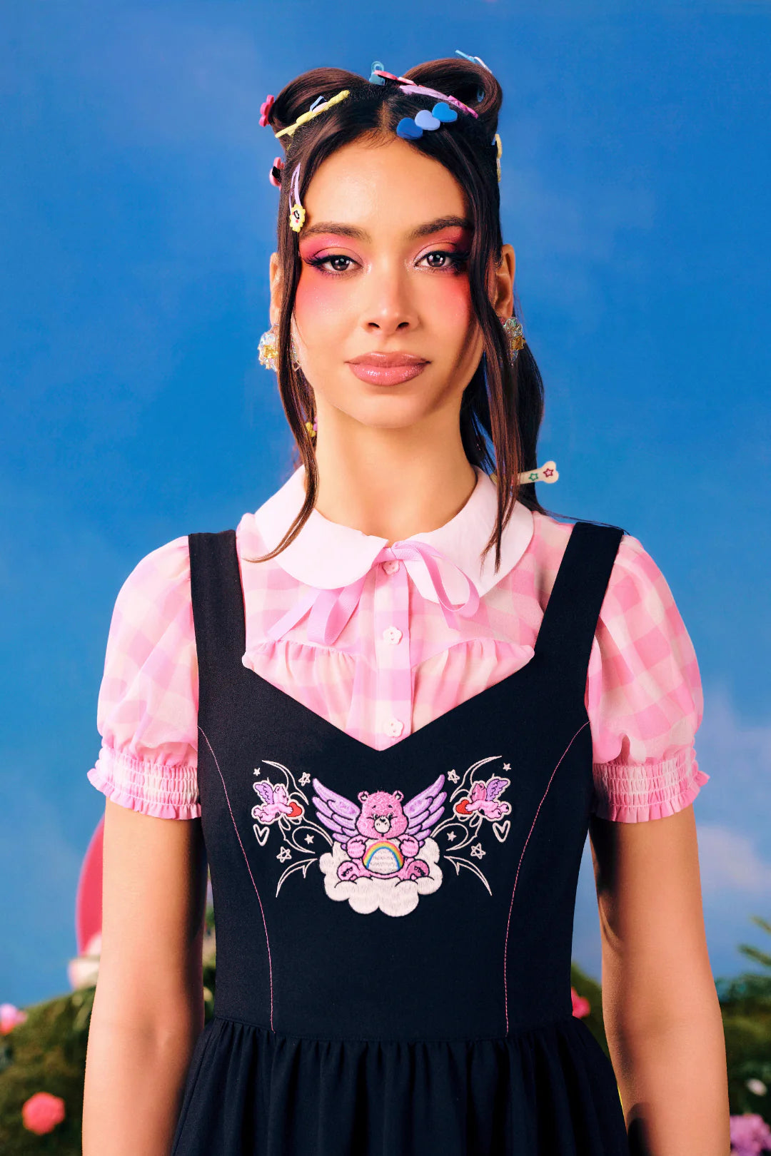 Part of Hell Bunny's collaboration with Care Bears, the Cheer Bear Dress! This black mini dress features adorable embroidery of our beary bestie, Cheer Bear, sitting on a cloud with mini cupid bears. The fitted bodice is shaped with princess seams and finished with contrast pink stitching to hug the waist, before finishing at the waist seam. The skirt is gathered for ample volume, with two frilled tiers at the hem for even more drama. Pair it with the Cindy Blouse pictured for a cute, Care-A-Lot-ready look!