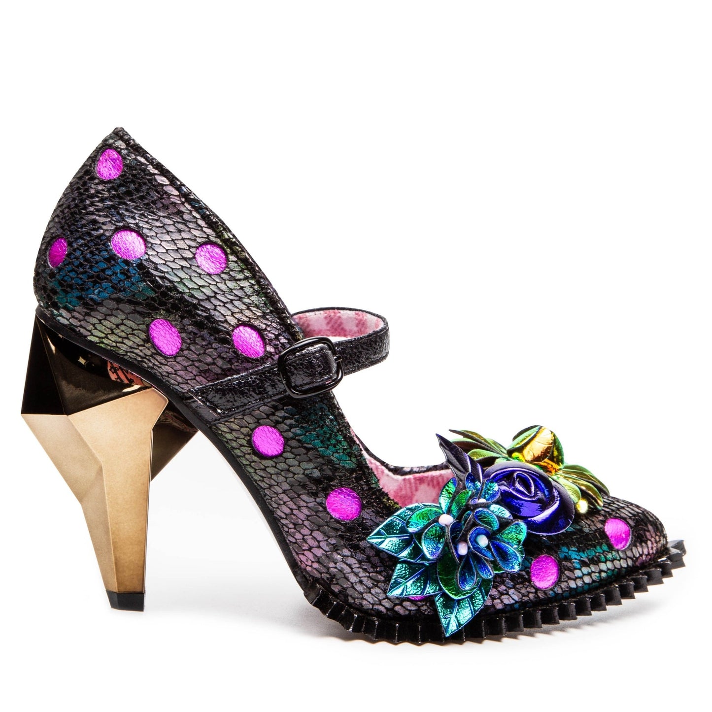 Channel your inner cosmic babe in a pair of these super striking heels. A lightning bolt prism design heel, with a metallic, bright pink polka dot glimmery top on a black background, featuring faux leather flower details and a deep velvet black scalloped edge outsole. Simply out of this world!