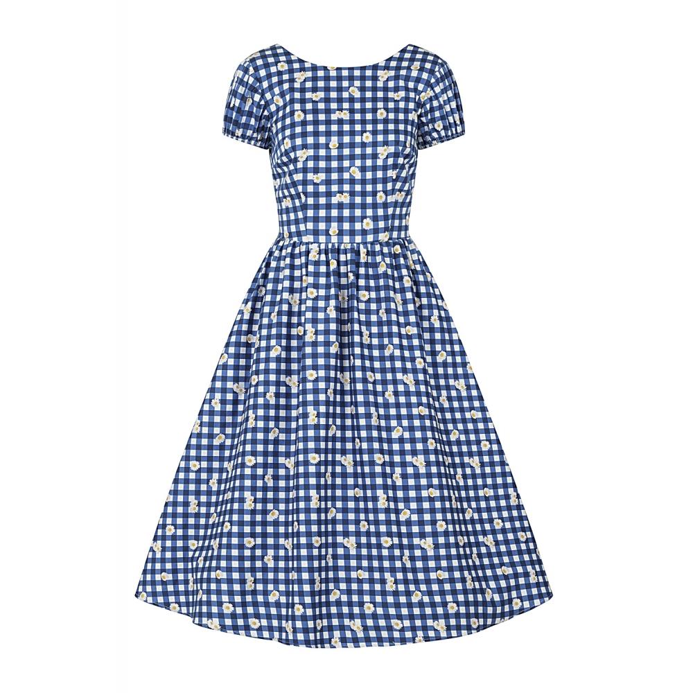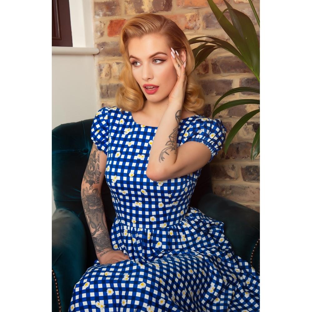 Fresh as a Demira Gingham Daisy Swing Dress! She’s a sweet summer style in a bespoke blue and white gingham print with little daisies scattered across. The dress itself features a fitted body with a crew neck at the front and elasticated puff sleeves, dipping into a V at the back. She fastens with a covered zip underneath and her gathered skirt has side seam pockets and flares out to approximately below the knee. For a classic look, team with a swipe of red lipstick and little white frilled bobby socks.