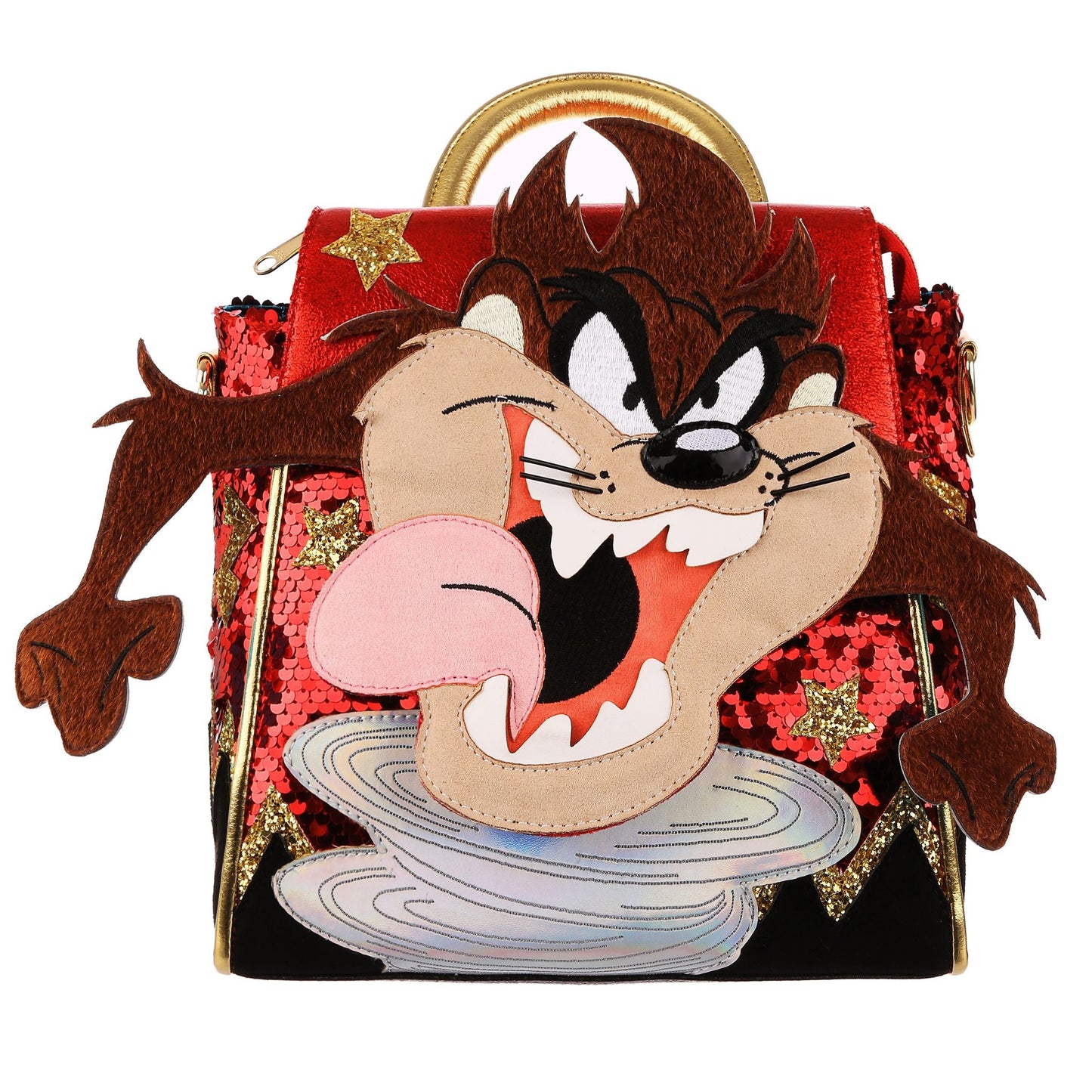 If you are a Tasmanian Devil lover, this whirlwind bag will definitely to make you happy! Taz adorns a fabulous bright red sequinned fabric, dotted with gold glitter stars, complete with an iridescent whirlwind! With a top opening flap, zip closure and inside zipped pocket, the multiway strap means this backpack can also be worn over or on your shoulder, for whatever mood you are in, it's ready to go!