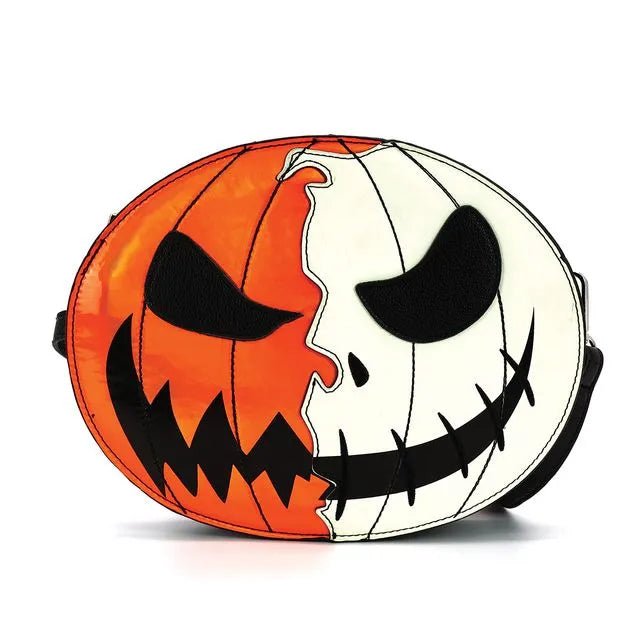 This bag is not your ordinary accessory. One side showcases a classic, cheerful jack-o-lantern face with a mischievous grin and friendly eyes, perfect for adding a whimsical touch to your Halloween festivities. On the other side, a spooky and sinister expression emerges, complete with a sly grin and haunting eyes, ideal for those who revel in the darker side of the holiday. Each side having a split orange and white colour design.