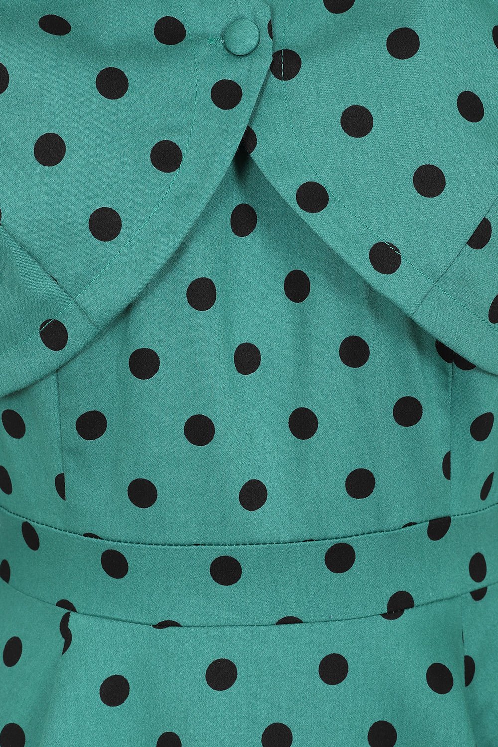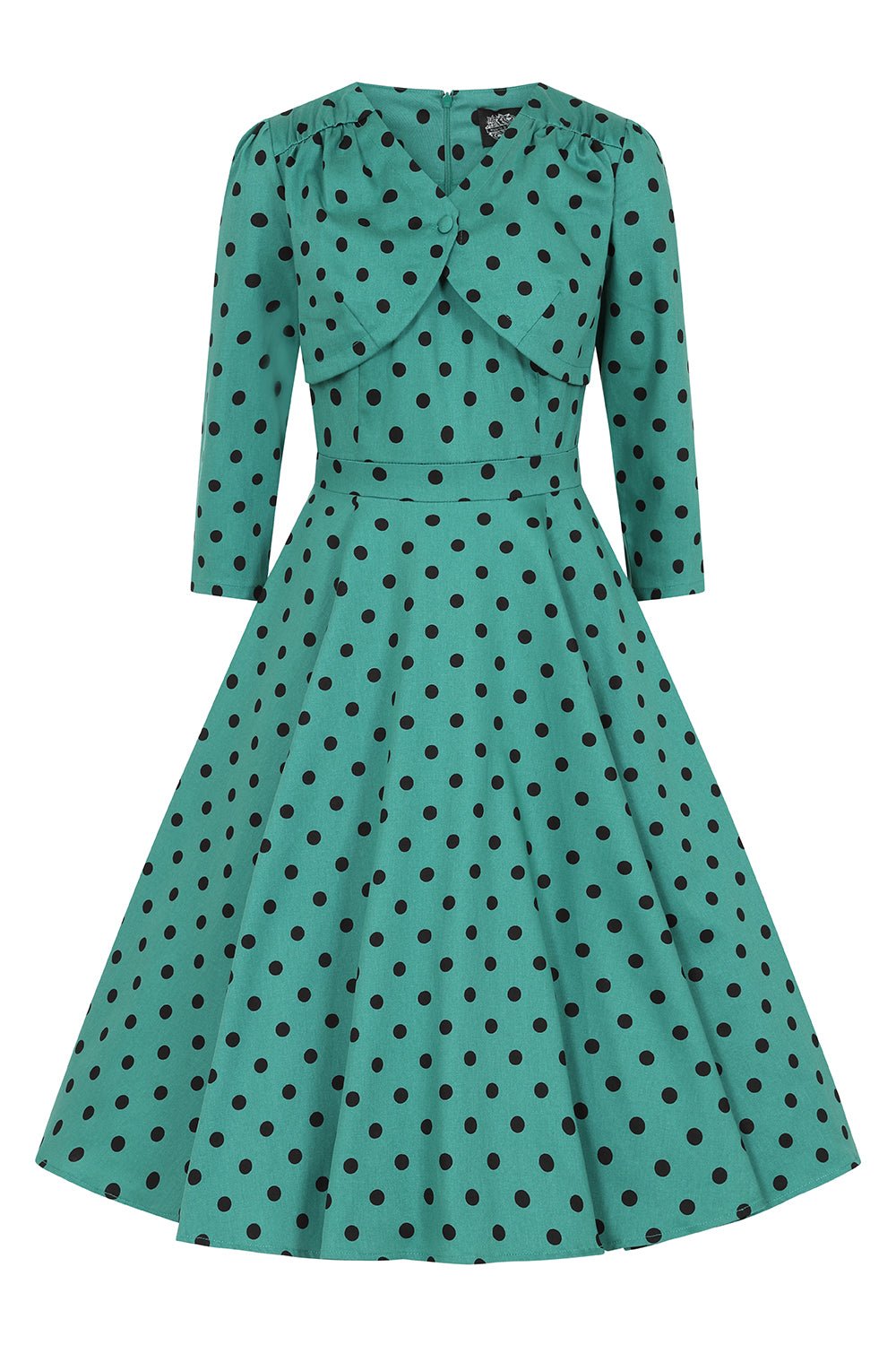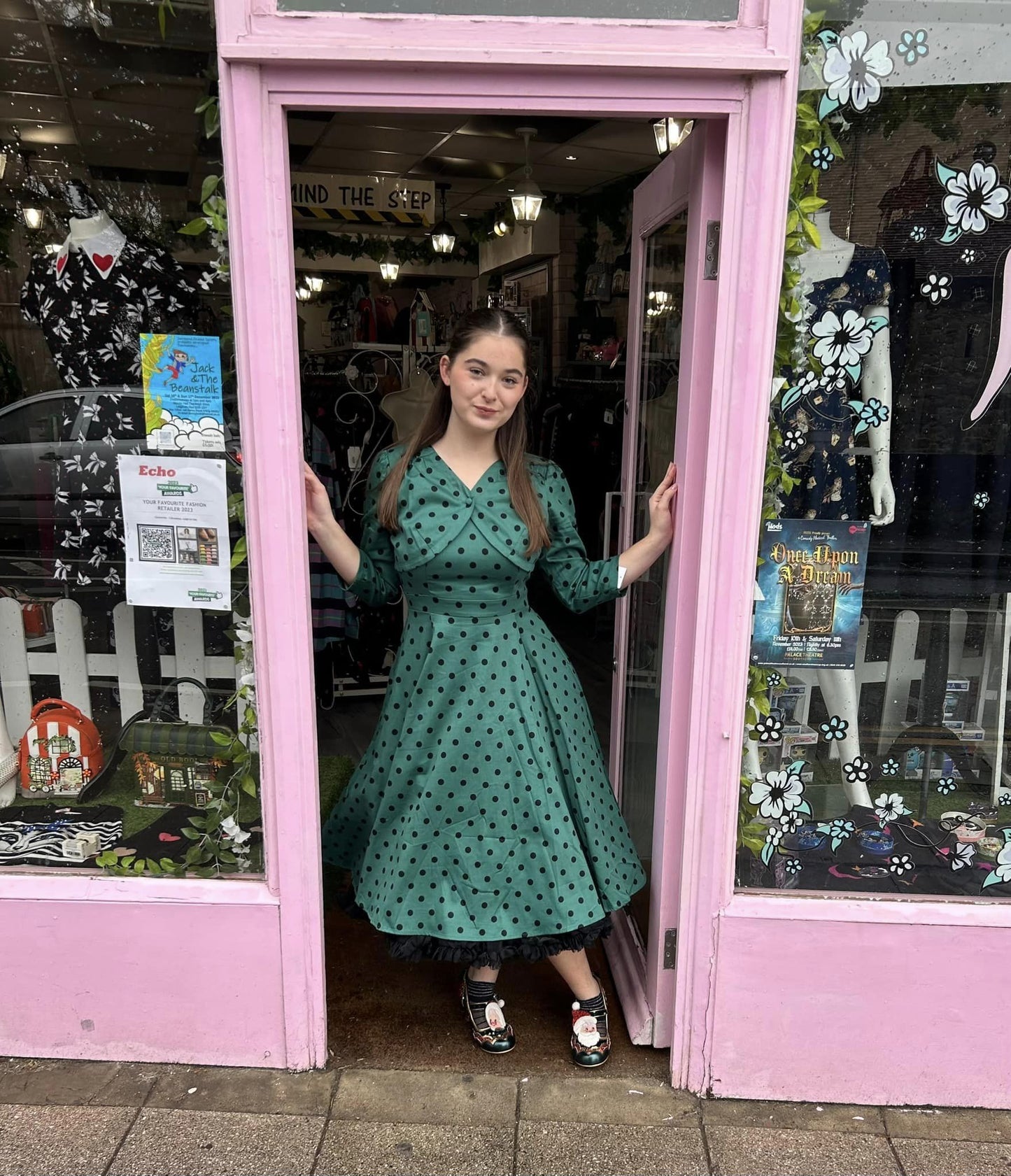 We can never get enough of polka dots! That’s why we have designed our brand new Finley Polka Dot Swing Dress to be soaked in black contrast polka dots, on top of a gorgeous green base. This style features a gathered yoke seam which leads to a built in bolero with single button closure. The gathered ¾ length sleeves fit perfectly against the fitted bodice and full swing skirt. The waist is accentuated by the waistband which sits neatly at the natural waist. The hidden side pockets sit in line with the side seams, making them hidden from view but super practical. This style stands out of the crowd, making it a showstopper for the winter season. Easily paired with flats or heels, this style is ready for your next event!