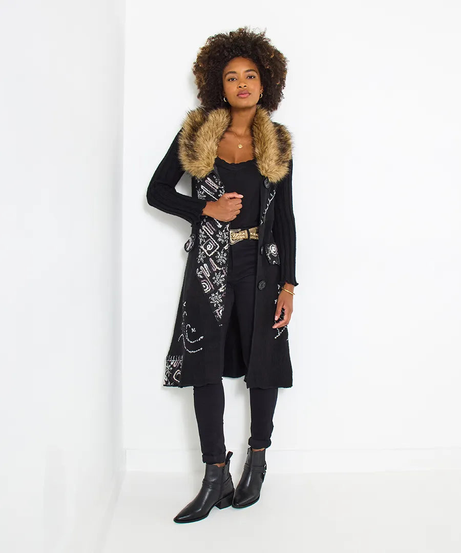 This ladies' embroidered cardigan is for wrapping up in elegance. Guaranteed to turn heads whether you're shopping, at the pub, or going out for dinner, it'll have you dressing in comfort and confidence every time. In a longline design with a decadent faux fur collar, this is unique knitwear done the Joe Browns way.