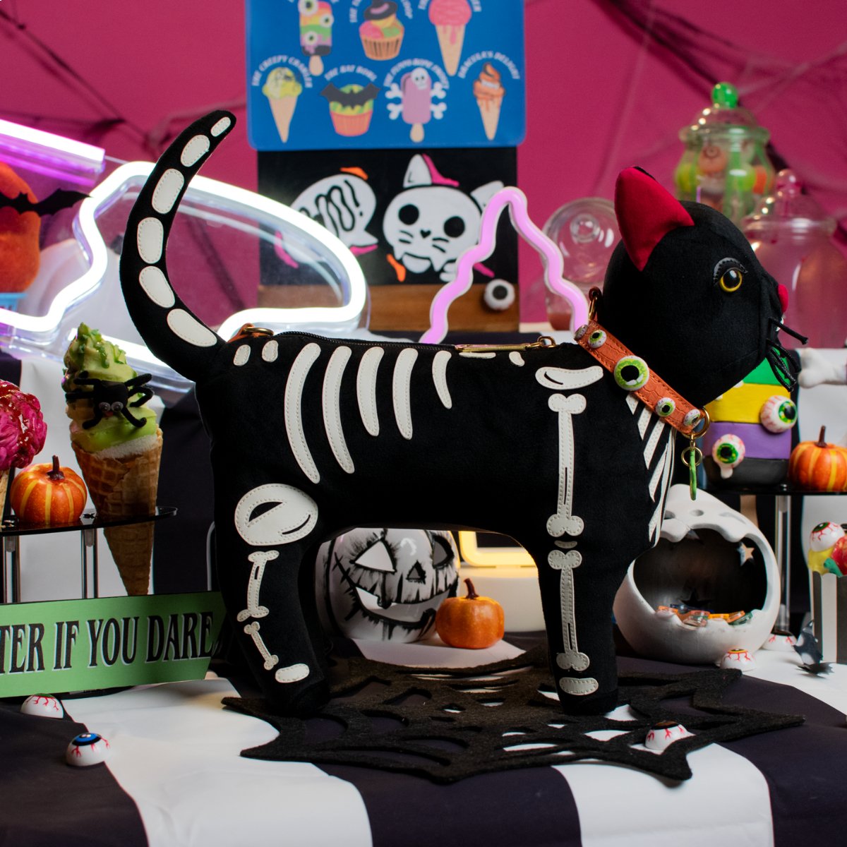 Our favourite little fur ball is back, just in time for Halloween! The I-Scream Parlour Skeleton Vinnie the Cat Bag can fit in all you need on the go. It is easy to carry, thanks to the strap it comes with, but you can also be mischievous and carry it like a real cat, to confuse people around you ;). How awesome does it look, with a glow in the dark skeleton, an ‘’eyeball’’ collar and those gorgeous little whiskers? This bag is the perfect ‘’dress to impress’’ accessory, giving you a funky look that many will envy. Seeing as he is a good boy, which awfully delicious treat should we give Vinnie… how about a ‘’Fangs Delight’’?