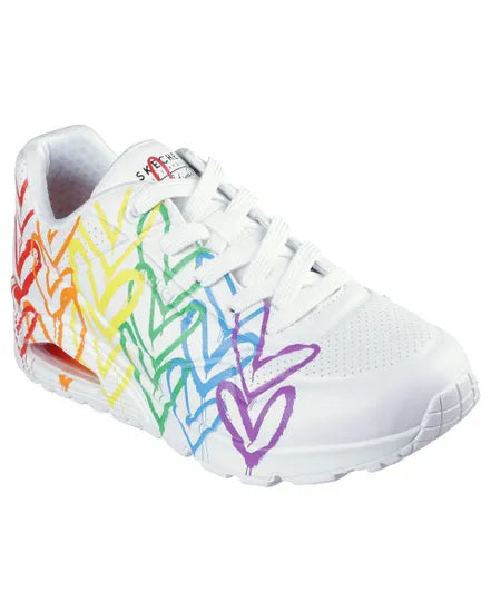 Internationally renowned muralist James Goldcrown brings his iconic #Lovewall heart designs to Skechers in this inspiring collaboration. Flaunt your love for love in colourful fashion wearing Skechers Street™ x JGoldcrown: UNO - Full Of Love. This lace-up fashion sneaker features the artist's signature heart design on a synthetic durabuck upper with a Skechers Air-Cooled Memory Foam® insole and a visible Skech-Air® airbag midsole.