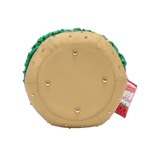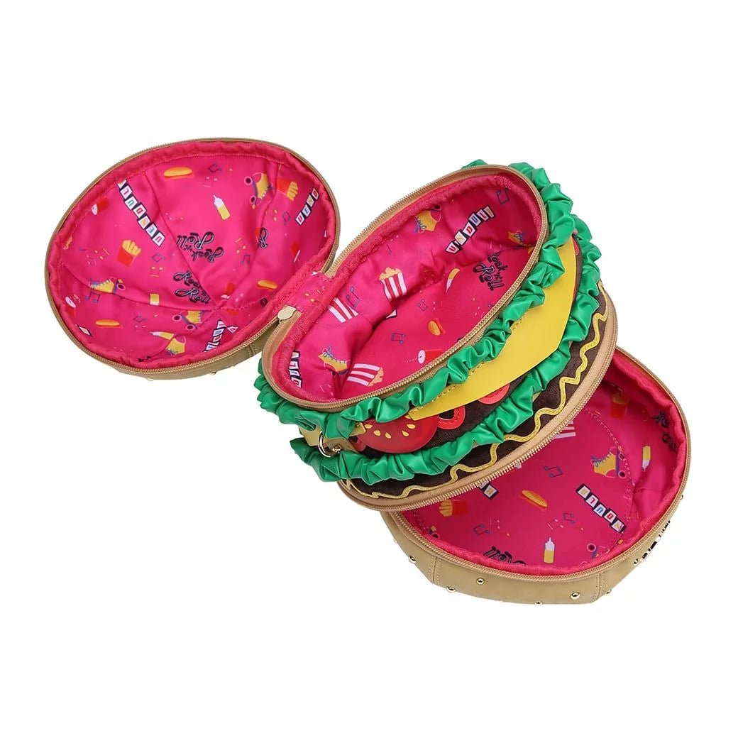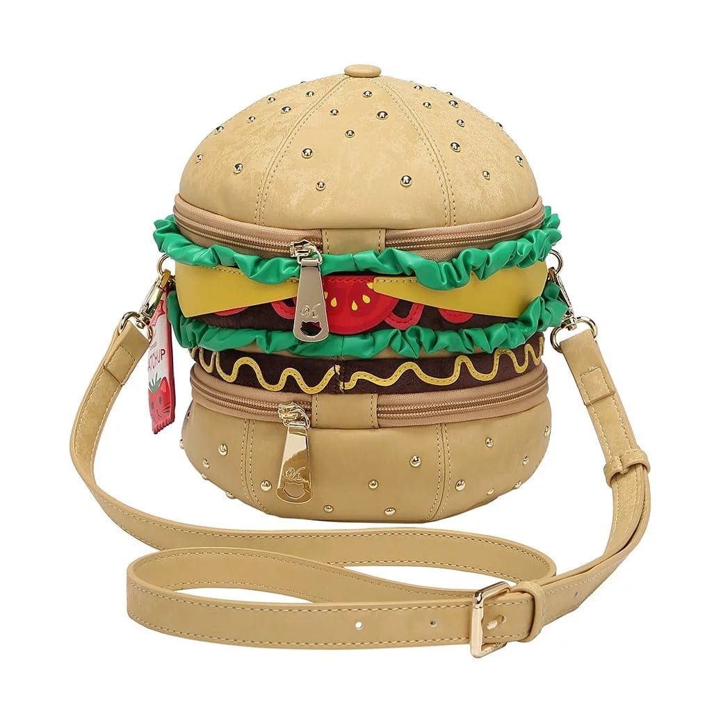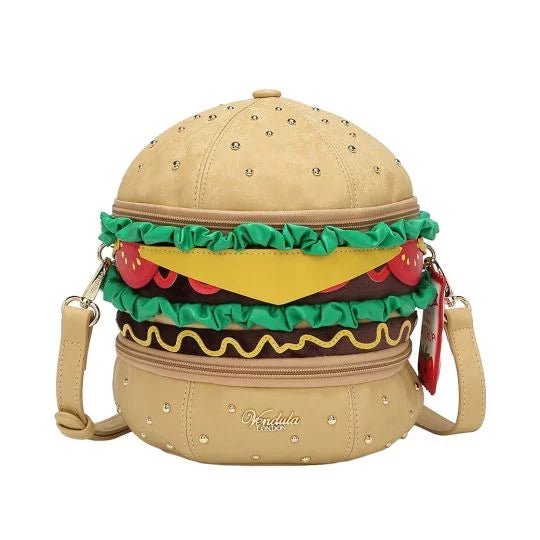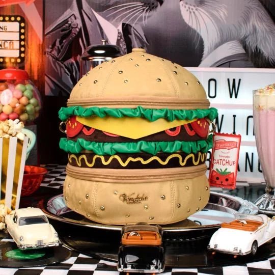 The Kitty's Drive-In Movie - Catablanca Burger Crossbody Bag comes with two separate zipped compartments for your essentials, and more. It is made of a matte, velvety vegan leather and it boasts a combination of several textures that give you the tastiest-looking bag you will ever own. Clip on the strap, carry it on your shoulder or crossbody and go about your day, making heads turn as you walk to work, to the pub or to the Kitty’s Diner for a well-deserved treat before going to the cinema. Fancy some ‘’catchup’’ with that vegan burger?