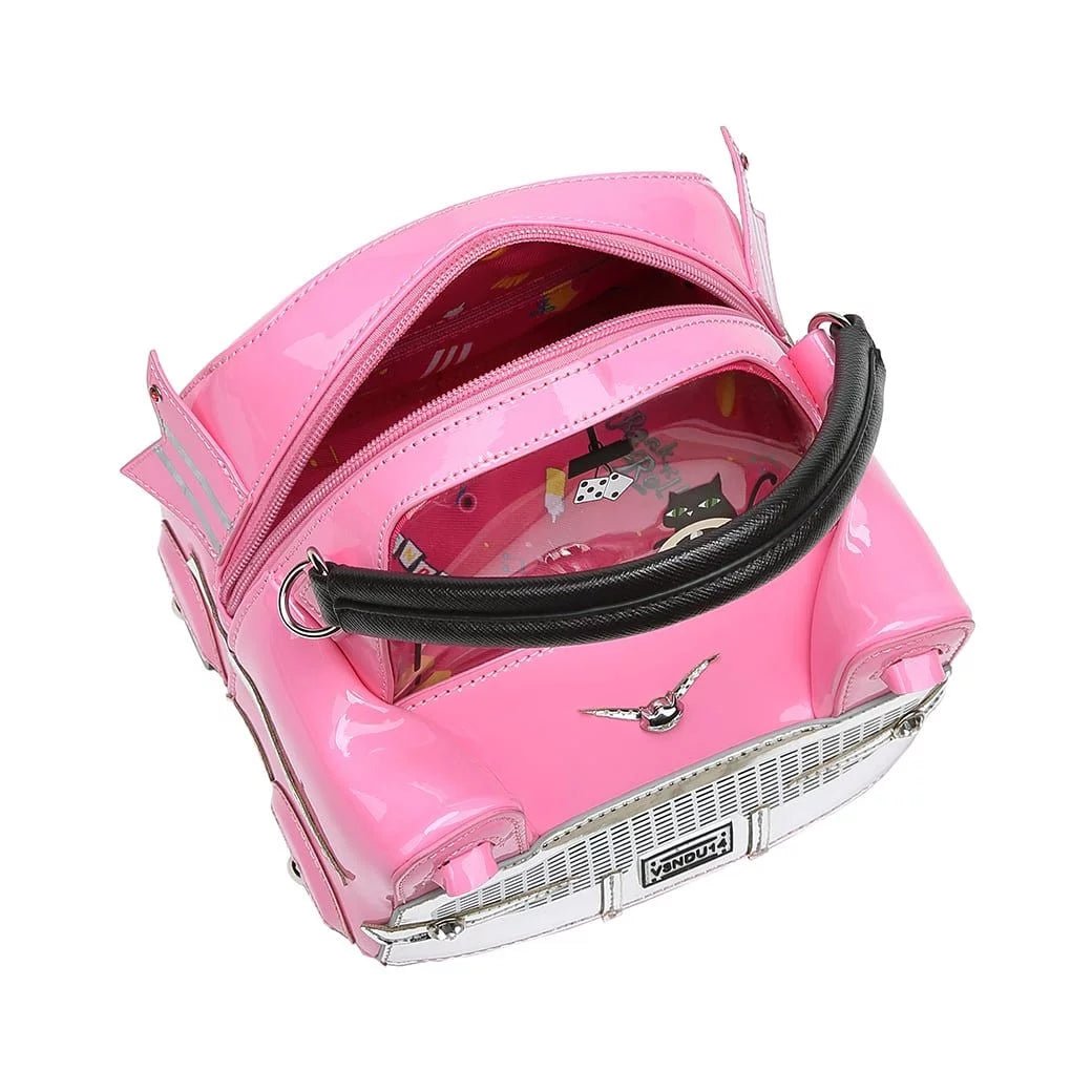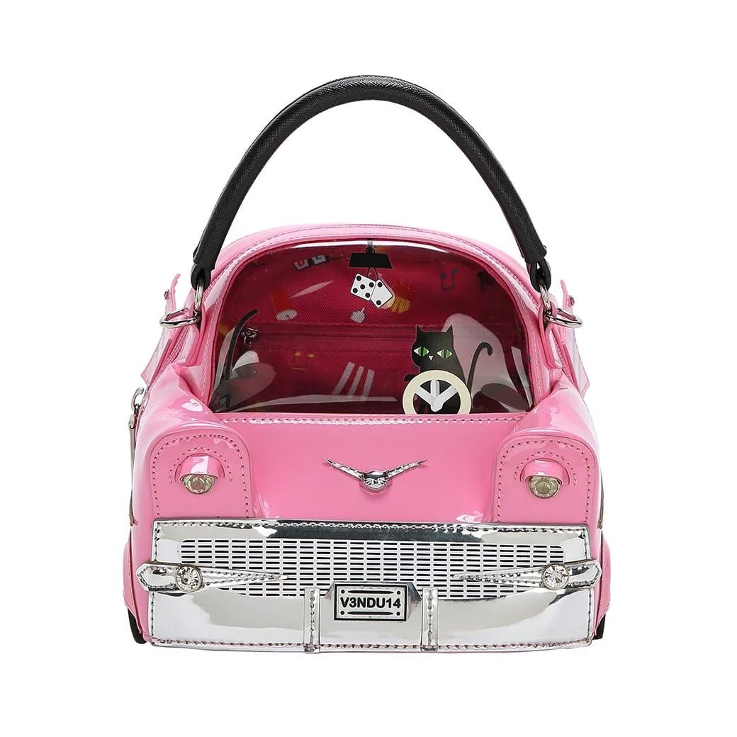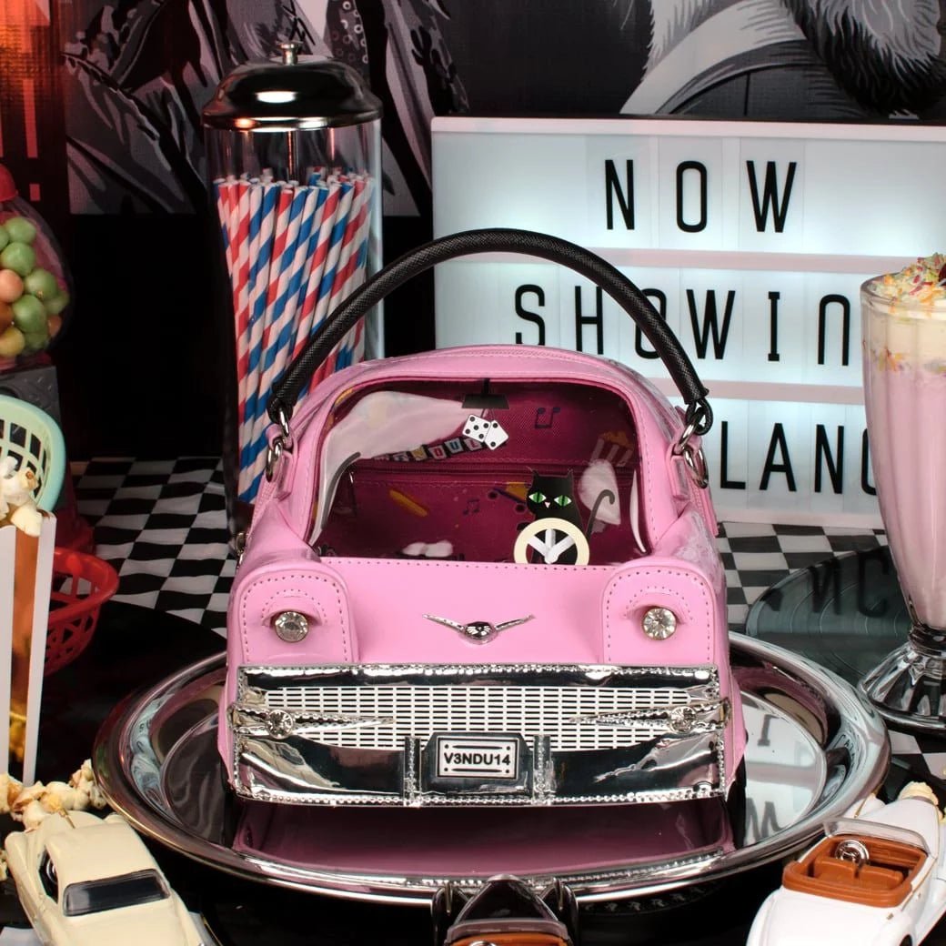 The Kitty's Drive-In Movie - Catablanca Cattilac Top-Handle Bag is a luxurious vegan leather accessory in which all of your essentials will nicely fit. It comes with a handle and a detachable strap so you can alternate the uses depending on the occasion. The front is see-through so no need to open the bag and rummage through its content to look for your Kitty’s Drive-In or Kitty’s Diner purse – how handy! How great does our Cattilac look with a very special chauffeur, gems, spanking wheels and a colourful lining? We bet you can’t wait to see your friends’ faces when you take this beauty out for the first time!