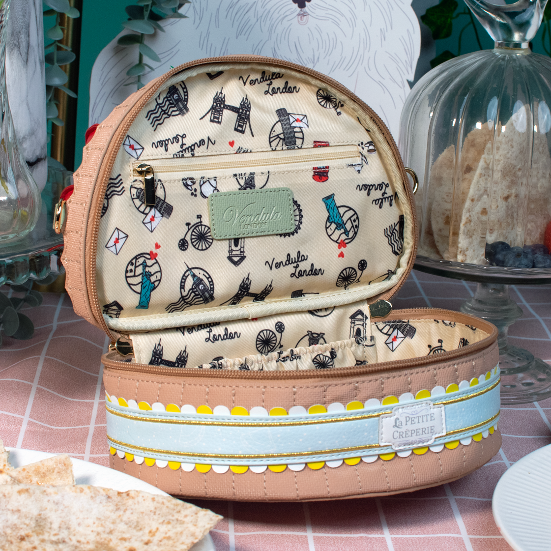 The La Petite Crêperie Strawberry Tarte Bag is a dream come true for pastry lovers! This novelty bag is ideal for garden parties or a day at the races. Carry it by the handle, over the shoulder, or crossbody, and rest assured that your belongings are safe with its zip closure. Those Eiffel Tower-shaped zip pullers are simply adorable! Crafted from vegan leather, this bag is a fashion statement in the shape of a strawberry tart, complete with realistic 3D strawberries.