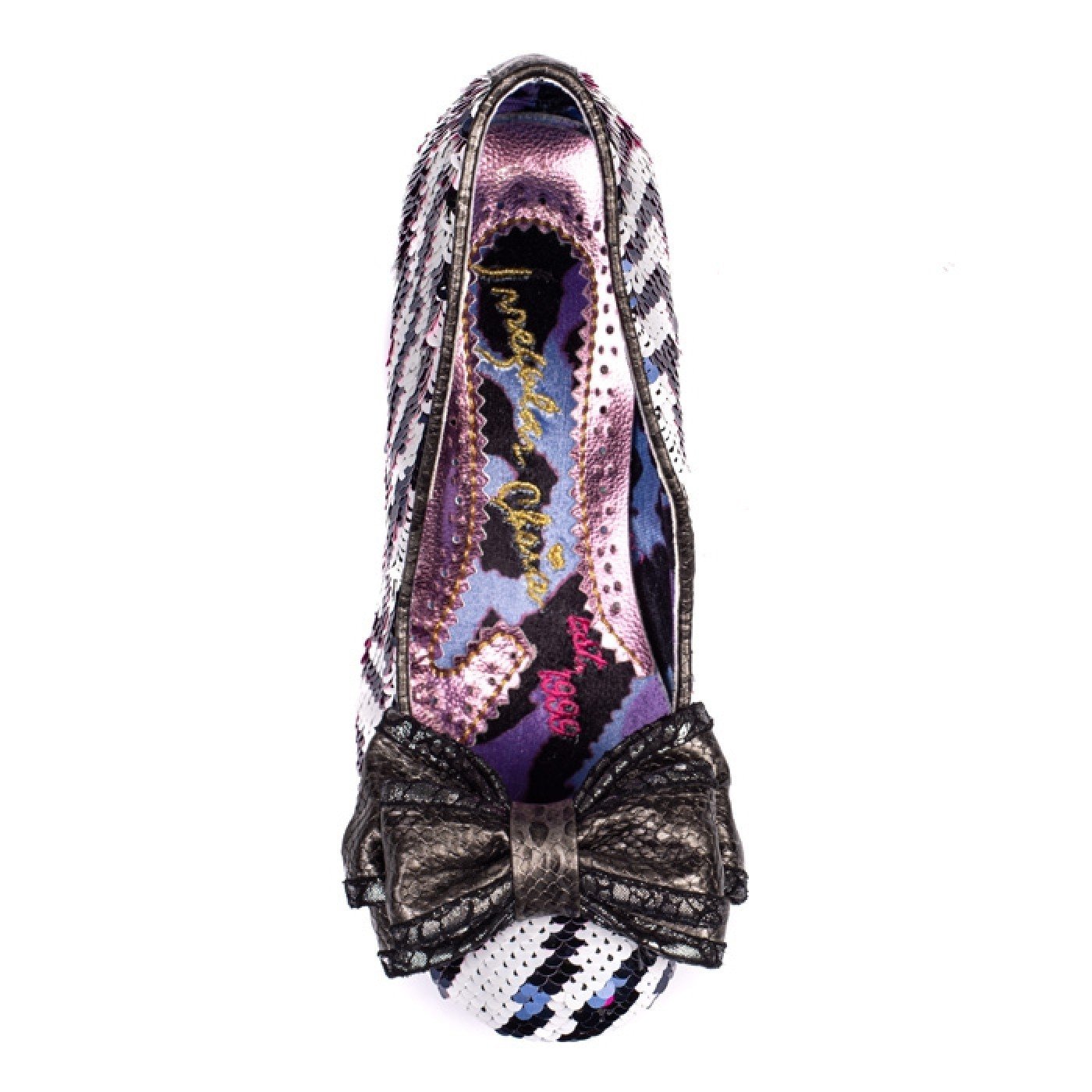 Embrace your inner 80's vixen in a pair of these sequin animal print beauties. Comes with a reversible pink and monochrome zebra sequin upper and faux snakeskin heel and matching double layered bow.