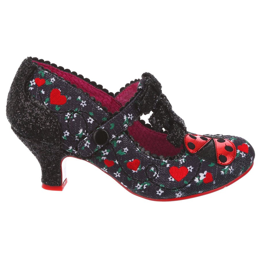 Flying along through the hedgerows its a lovely little ladybug! Swirling lines criss cross along the magical monochrome floral fabric leading to the adorable little red ladybug applique on the toe! These black T-Bar straps are also adorned with three little black glitter encrusted bows along the front strap! Perfect and prim, add them to your life today!
