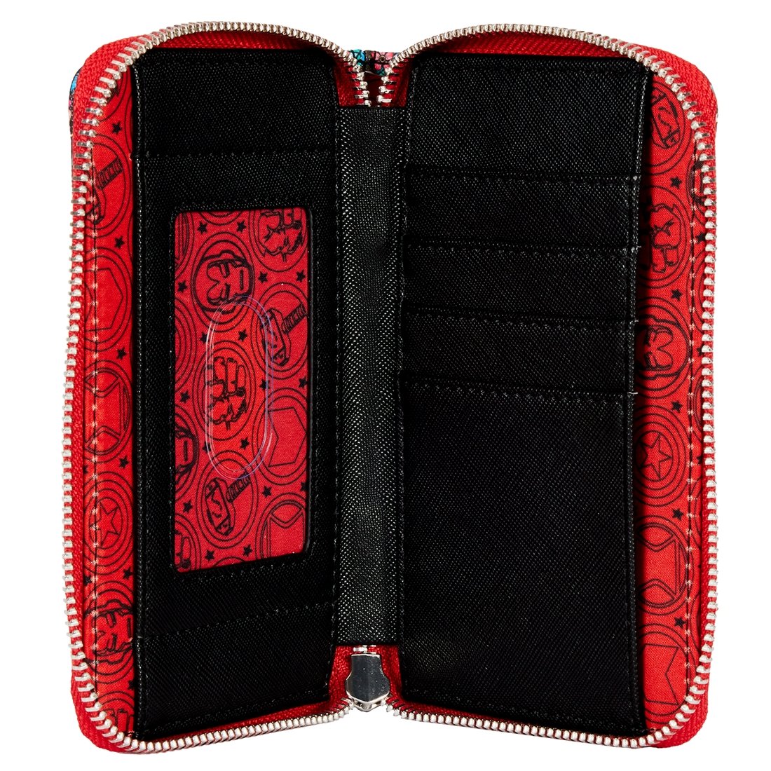 Assemble a superhero team to help you power through your day with this Marvel Avengers Tattoo Zip Around Wallet. Captain America, the Hulk, Iron Man, Thor, the Black Widow, and Hawkeye gather in a classic rose tattoo motif on this zip around wallet. A galactic star pattern serves as a background. It’s the perfect accessory for carrying your valuables in superhero style. Wallet zips closed and features include shiny silver hardware, vegan leather (polyurethane), four card slots, a clear slot for holding your ID, and printed details. Note the coordinating lining. This wallet is an officially licensed Marvel product. Wallet dimensions: W 16.5 cm x H 10 cm (Please note: Width is measured across the bottom of the wallet.)