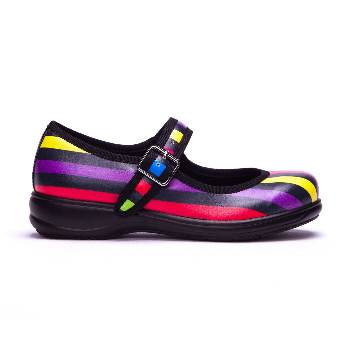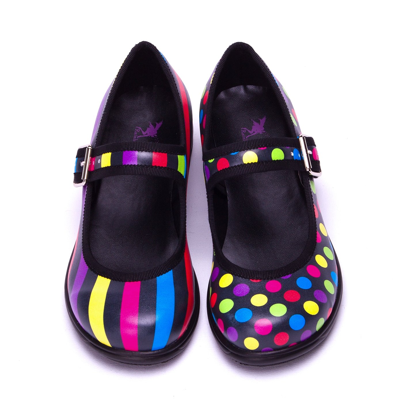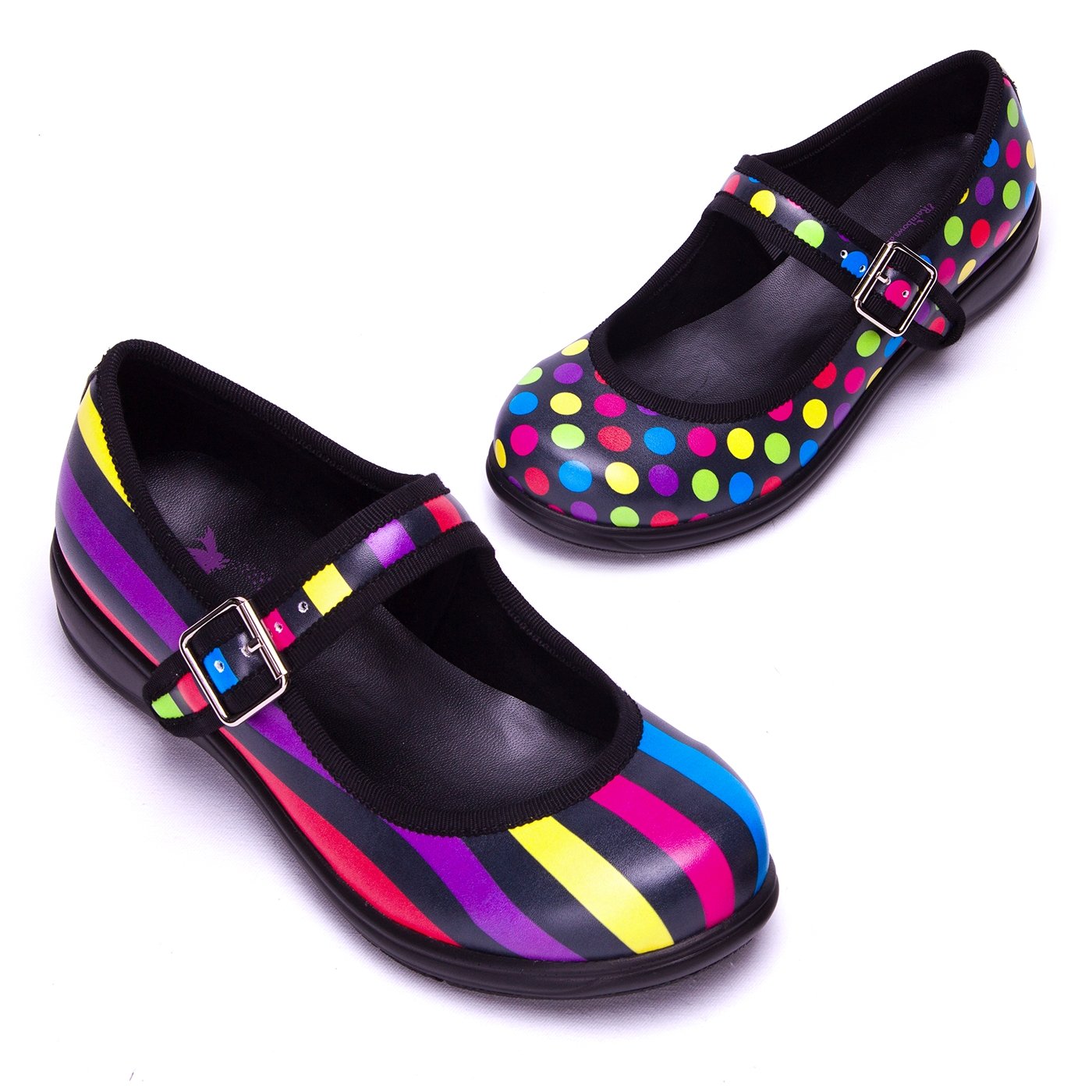 One shoe is red, green, blue, yellow, pink and purple polka dot print on a black background …very playful!