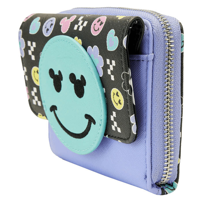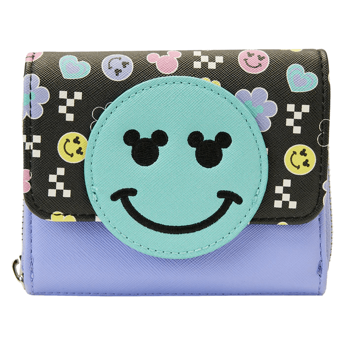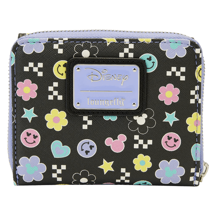 Add some bling to your wardrobe with a trendy throwback! The Loungefly Mickey Y2K Flap Wallet rewinds motifs from the early 2000s, featuring an allover print of pastel hearts, stars, flowers, and more. A smiley face takes shape on the front of the wallet, snapping an exterior pocket in place. With four slots for holding cards and a clear slot for holding ID, this totally sweet accessory will keep your belongings safe while you’re hanging with your BFFs.