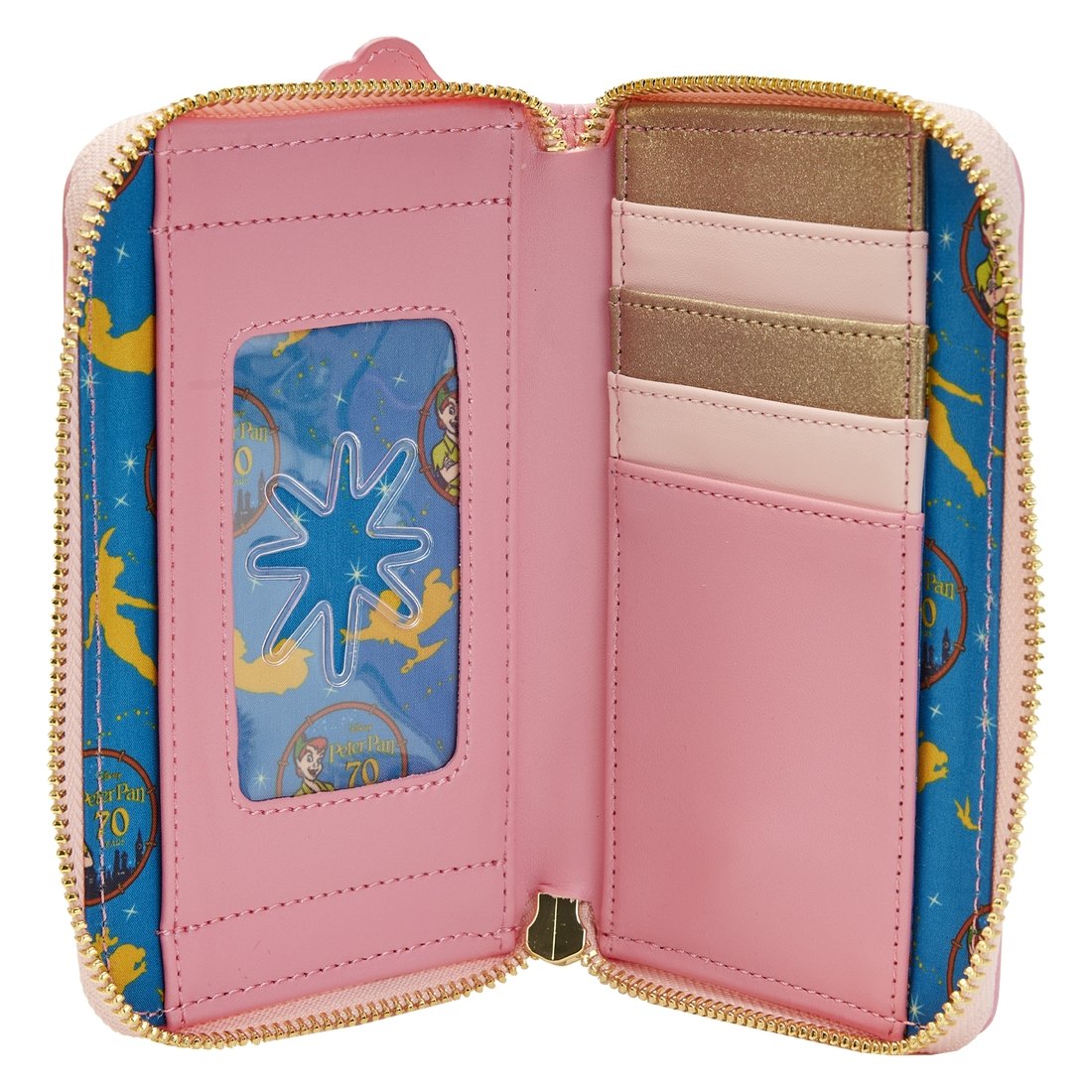 Think happy thoughts and your dreams will take flight! The Loungefly Peter Pan You Can Fly 70th Anniversary Zip Around Wallet sets a scene from the Disney animated classic. On the front, the Darling siblings soar across the ceiling of their bedroom. On the back, Tinker Bell pouts while sitting on a toy block. With five slots for holding cards and a clear slot to hold ID, this whimsical accessory will keep your belongings safe on any adventure. The Loungefly Peter Pan You Can Fly 70th Anniversary Zip Around Wallet is made of vegan leather (polyurethane) with glitter trim. Wallet zips closed with sturdy metal hardware. Additional features include applique, foil, embroidered, and printed details. Take note of the coordinating inside lining. This wallet is an officially licensed Disney product.