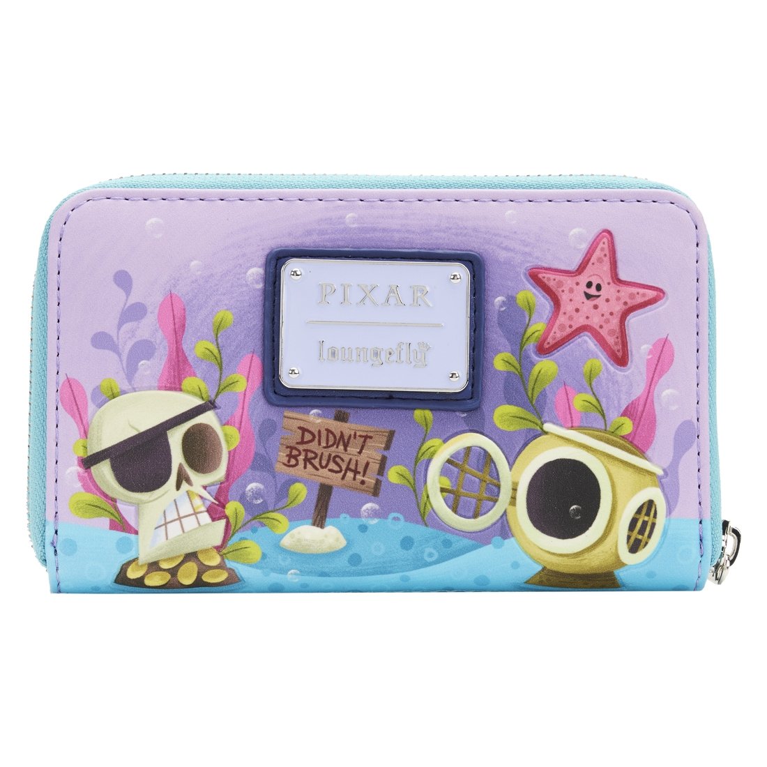 Climb atop Mount Wannahockaloogie and join Nemo’s new friends with this Loungefly Disney-Pixar Moments Finding Nemo Tank Zip Around Wallet. You’ll find Nemo, Bloat, Gill, Gurgle, Bubbles, Deb, and Jacques, brought to life in debossed detail, swimming among a sea of bubbles. On the back, Peach makes a star appearance. The pirate skull decoration and “Didn’t Brush” sign not only offer the fish a place to hide, but they’re delightfully ominous reminders of the adventures that await Nemo and his friends in Dr. Phillip Sherman’s Dentist Office. Even the copper helmet scuba diving decoration finds a place in this scene! Inside the wallet, there are 4 slots for holding cards and a clear slot for holding your ID. The clear slot even includes a die-cut Nemo-shaped window. It’s the perfect accessory for any Disney outfit—or for turning everyday outings into magical adventures.