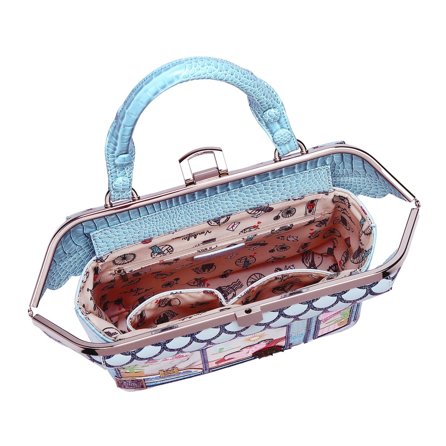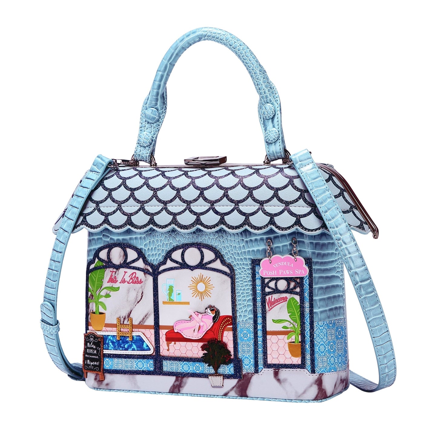 What a Vendulette, a Vendulette get...the famous Grab Bags are back! Made from a blue faux croc Vegan leather, that looks like the ripples of a sun kissed sea, the Posh Paws Spa Grab Bag has a strong clasp closing to ensure the safety of your belongings, and a few pockets to keep you organised. Just look at that cute doggy having a pampering day. Maybe we could book a day off and head to the nearest spa too! That pool looks really inviting and I'm sure there will be room for too if that pampered pooch budges over!