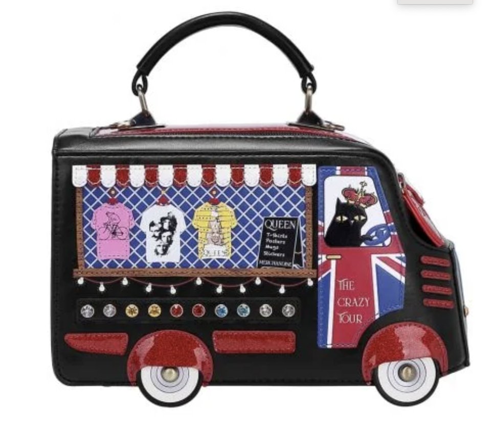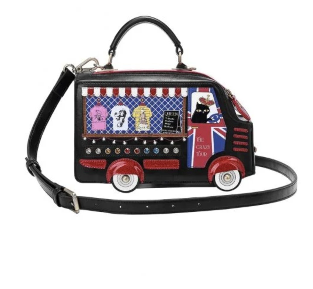 Get ready for the Crazy Tour with the Queen X Vendula Tour Bus Grab Bag! Our famous truck shaped bag has turned into a merchandise bus and our ‘’Cool Cat’’ is at the wheel, selling t-shirts, posters, mugs and stickers. It is easy to carry thanks to the comfortable handle and strap, and can hold all you need, day and night, with a roomy compartment. It is in our lovely vegan leather so you can rock it this season! Go on, you know you want to!