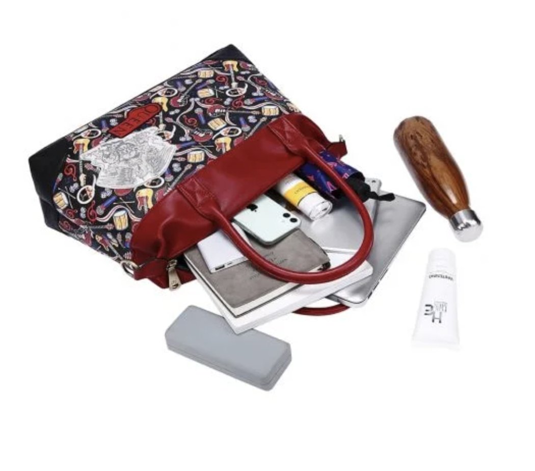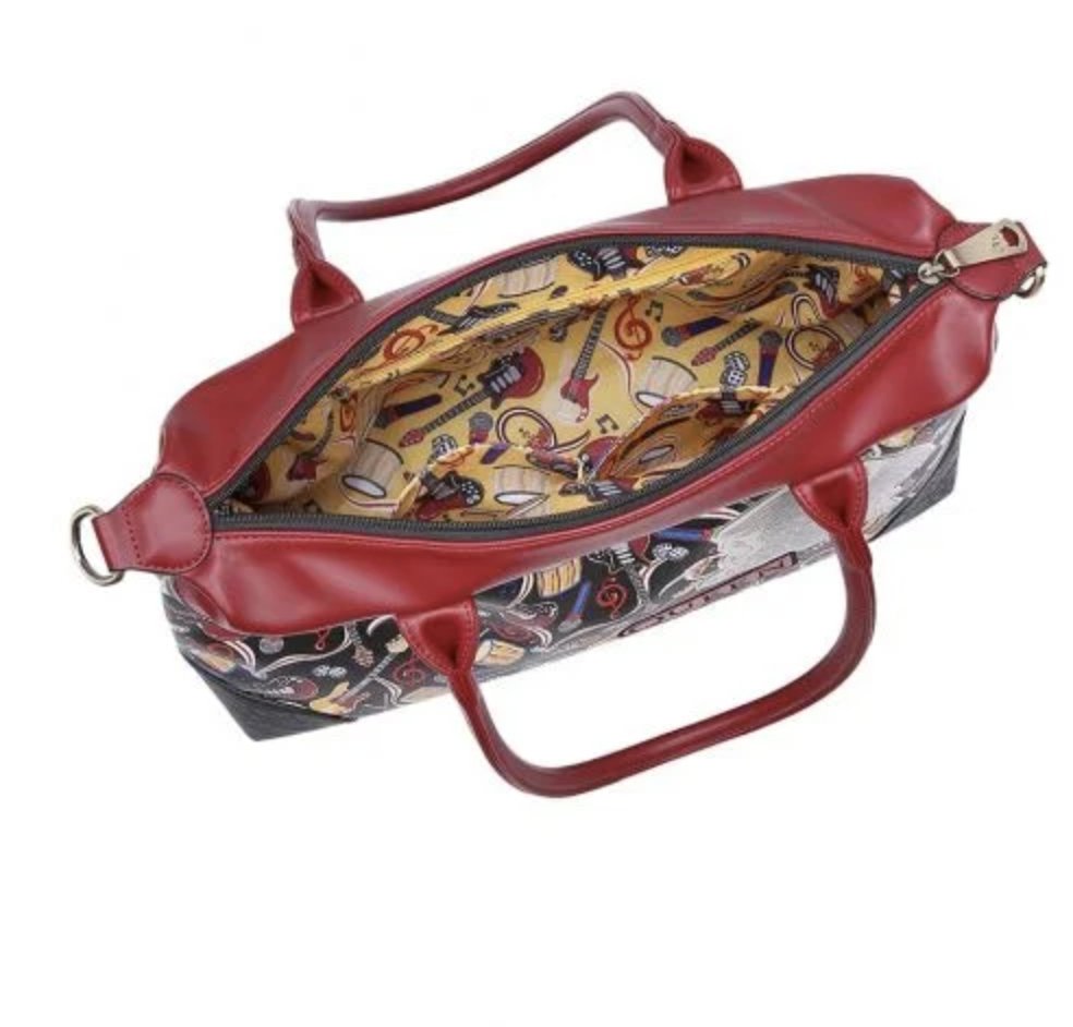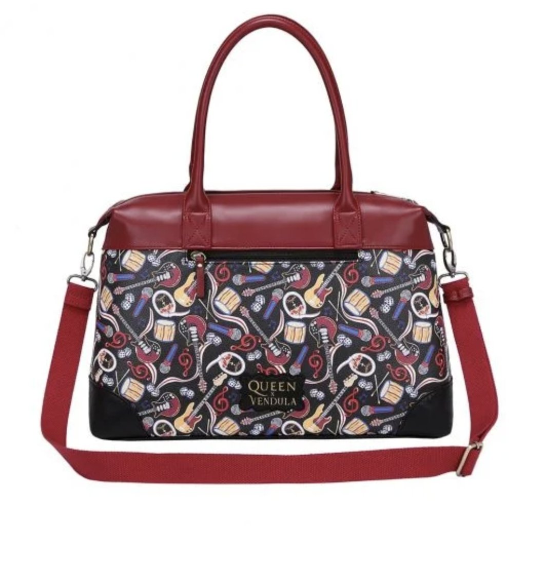Show your Rock Chick side with our Queen X Vendula Weekender Tote! What a great everyday bag this tote is, with plenty of space and four pockets to keep your daily or weekend essentials safe and secure. It has a comfortable handle and strap so you can use it as a grab, crossbody bag or over the shoulder. It comes in our trademark vegan leather with music notes, colourful instruments and of course the band’s logo. Rock the look with this Weekender Tote!