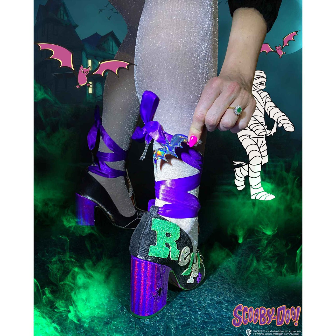 Wrap your legs up like a spooky mummy with these adorable heels! Featuring a super cute purple leg ribbon which is tipped with bats, these showstoppers feature some great Scooby sayings on the side in glitter textures, as well as artwork of a wrapped up Scooby and mummy on the front of the foot too! Great for anyone who wants a bit of ghostly glam in their wardrobe!