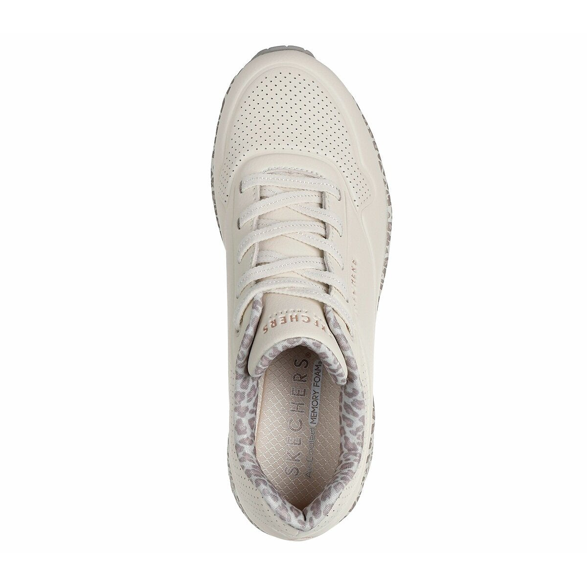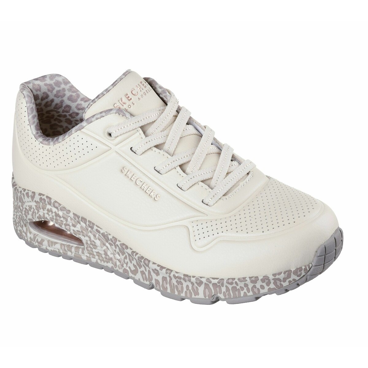 Walk on air in the wildly comfortable Skechers Street™ UNO - Safari Time. This stretch-laced fashion sneaker features a duraleather upper with a leopard print midsole and lining, a Skechers Air-Cooled Memory Foam® insole, and a visible Skech-Air® airbag midsole.