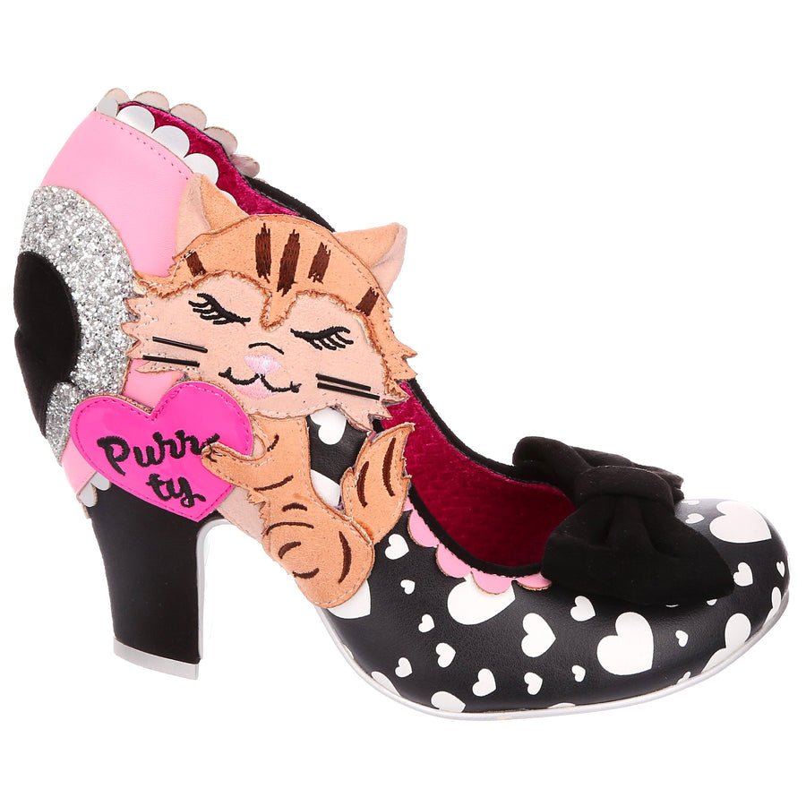 Be your own smitten kitten in these darling kitty cat heels! Perfect for a cat person, these pink, silver and black wonders are dazzling and darling, featuring two fabulous felines holding hearts with romantic messages inside. The black glitter bow on the toe matches the encrusted heel, and the scalloped edging along the back edge is the perfect tiny detailing to make these a pair of shoes you will never forget! A wonderful gift for a cat lover to show them how much they mean to you!