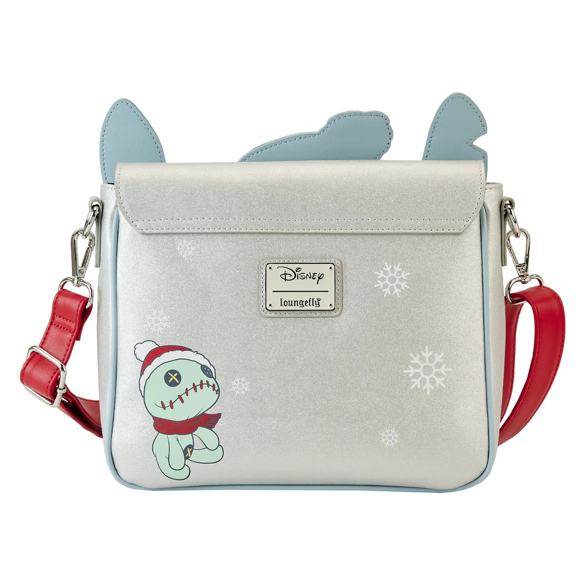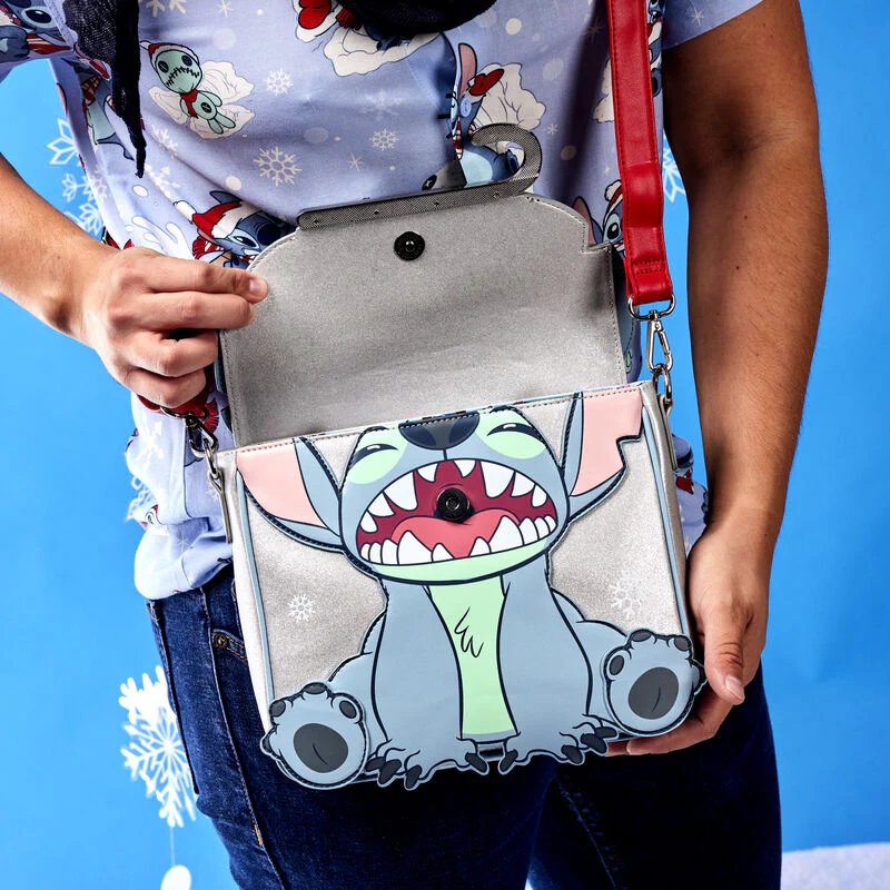 Bundle up, it’s time to play! The Loungefly Stitch Holiday Cosplay Crossbody Bag sets the scene for snowy fun. On the front, Stitch wears a festive hat while snacking on an enamel candy cane. Lift the bag’s top flap to reveal Stitch with an alternate facial expression! A background of glittery snow appears behind him and continues across the body of the bag. On the back, Scrump wears a cozy hat and scarf while watching snowflakes fall. With plenty of room to pack your playdate essentials, this bag is the perfect accessory for winter adventures with friends.
