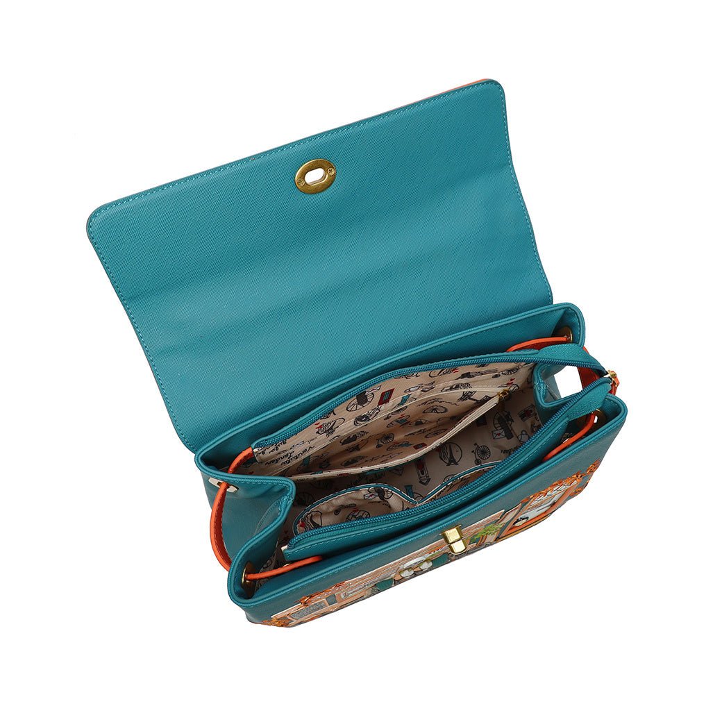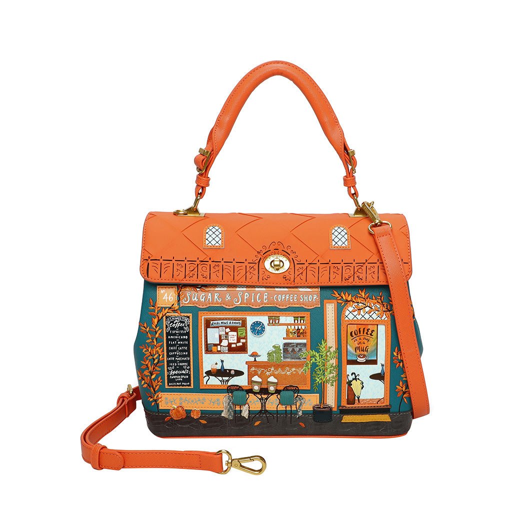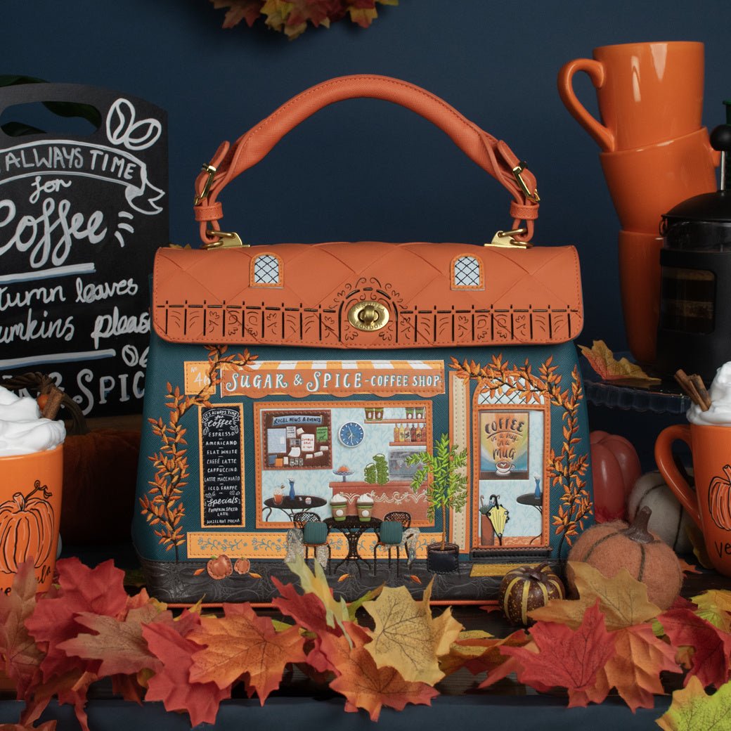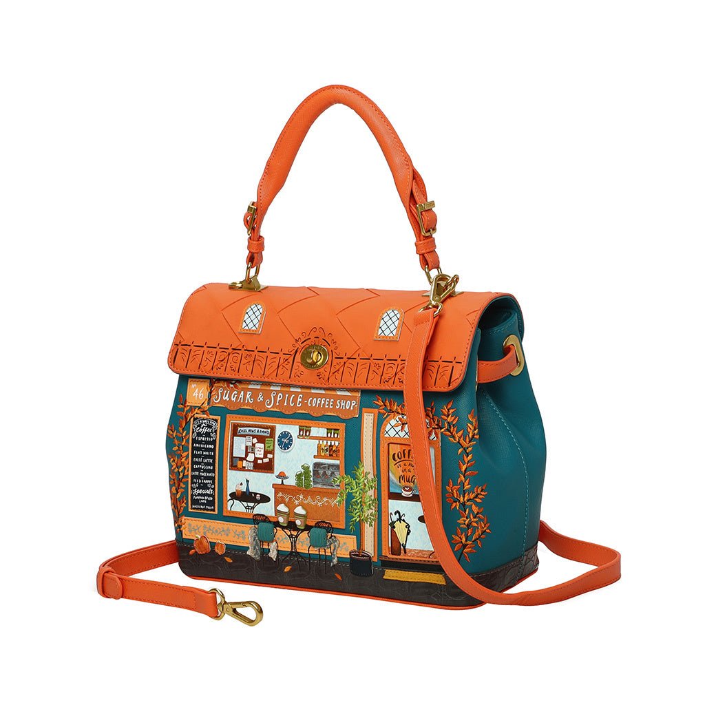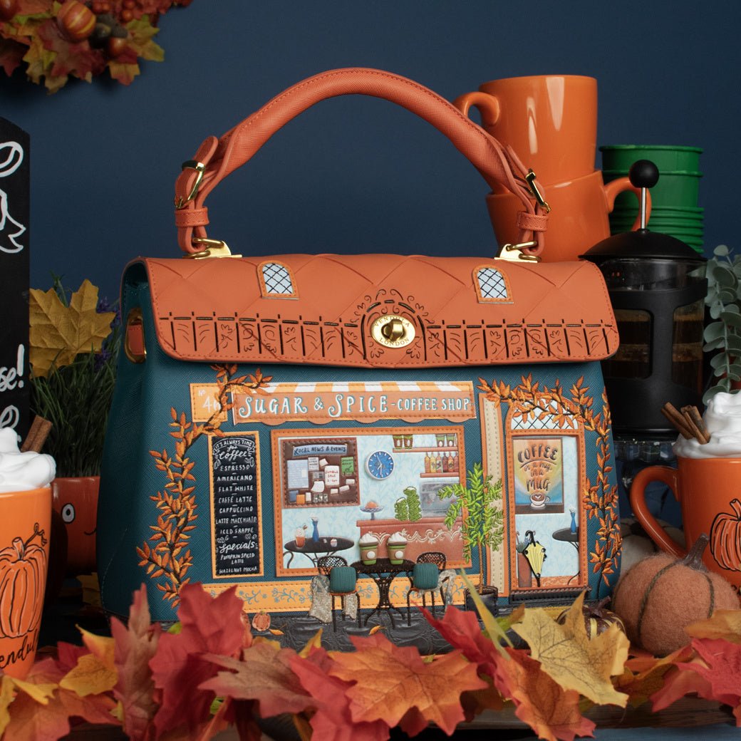 Are you a ‘’coffee first, socialising later’’ kind of person? The Sugar and Spice Coffee Shop Grace Bag may shake your priorities up a little bit! Given its autumnal appearance and warm tones, this new shopfront bag made of vegan leather will intrigue anyone you meet, and it won't be long before you're asked the famous question: "where did you get this bag?". Our Grace Bag can fit in all of your essentials, thanks to a spacious main compartment and multiple pockets. It comes with a detachable handle and strap, which allow you to carry the bag as you prefer. Needless to say, it is the perfect everyday bag, and we're sure you will depend on it as much as your well-deserved 11am mocha fix!