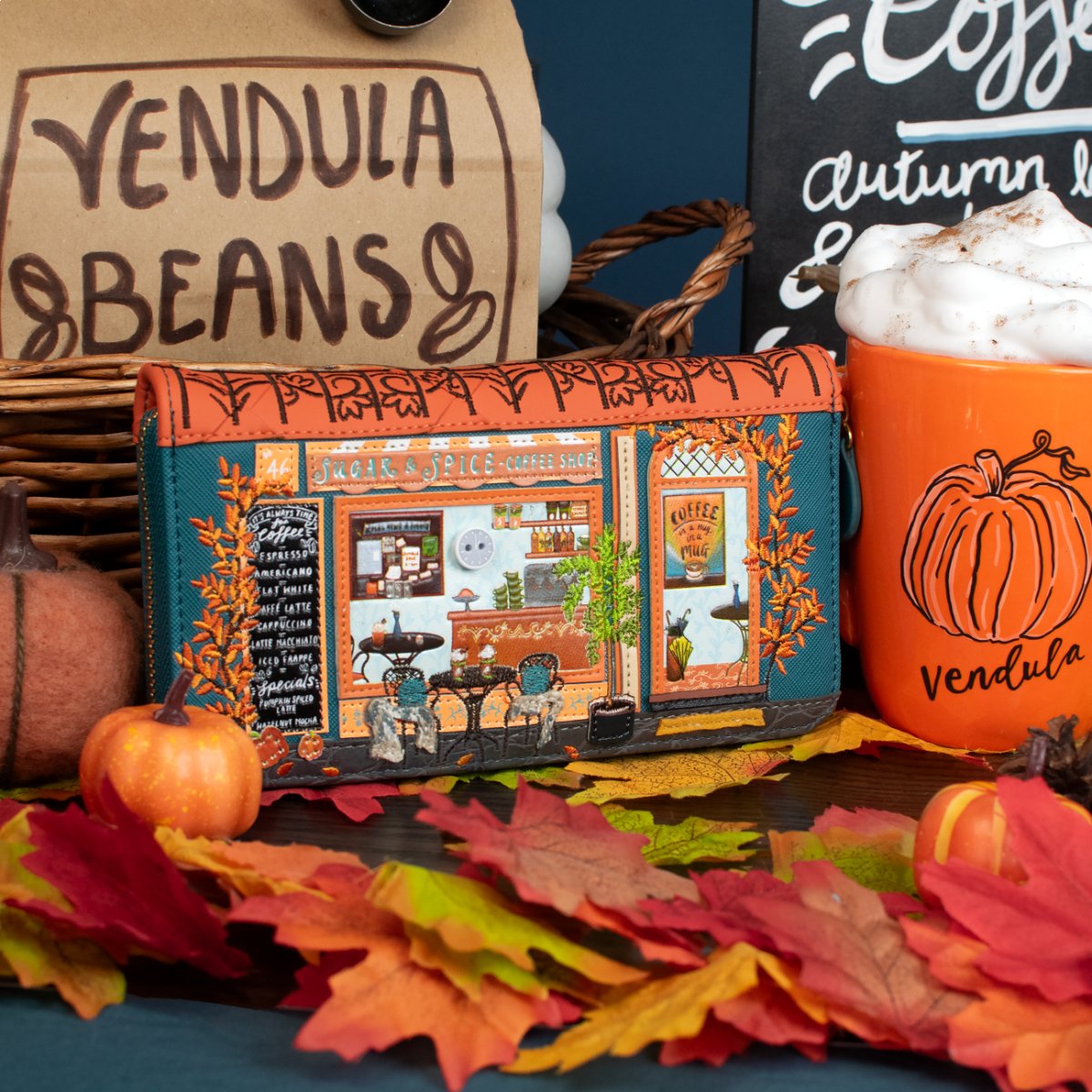 Coffee and pastry go hand in hand, and so do our bags and wallets! The Sugar and Spice Coffee Shop Large Ziparound Wallet can fit in most bags. It has plenty of room for cash, with a dedicated zipped pocket for coins, emplacements for notes and receipts, and a few card slots. Made of vegan leather, this Vendula wallet sports a similar artwork as the bags, with printed and 3D details. You will cause a stir at your local coffee shop with this new accessory and its matching bag. Draw out the pleasure by taking a few extra seconds to place your order, so the barista can admire your wallet a little longer!