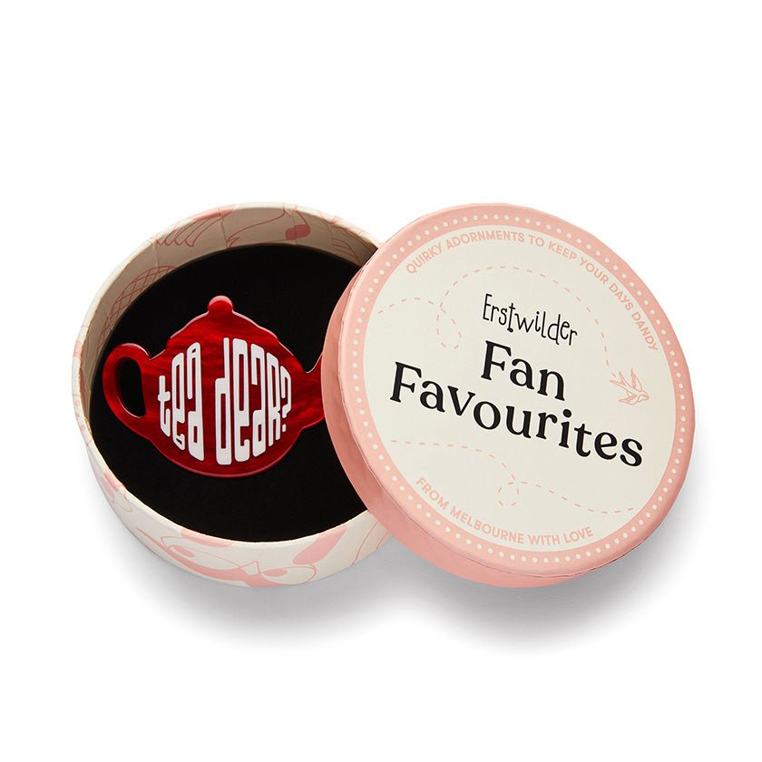 Please be aware that resin is akin to ceramic and glass and therefore may be damaged if dropped or knocked. Due to the use of high quality silver-plating in our brooch clasps, tarnishing and oxidisation can occur, producing black and gold discolouration. As with all silver products, you can simply restore it using a silver cloth. Keep your Erstwilder companion neatly tucked away in this box when not being worn, avoid contact with perfumes, lotions, water and excessive sunlight and you’ll have a trusted friend for years to come.