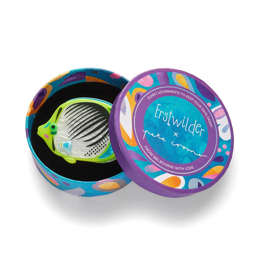 Please be aware that resin is akin to ceramic and glass and therefore may be damaged if dropped or knocked. Due to the use of high quality silver-plating in our brooch clasps, tarnishing and oxidisation can occur, producing black and gold discolouration. As with all silver products, you can simply restore it using a silver cloth. Keep your Erstwilder companion neatly tucked away in this box when not being worn, avoid contact with perfumes, lotions, water and excessive sunlight and you’ll have a trusted friend for years to come.
