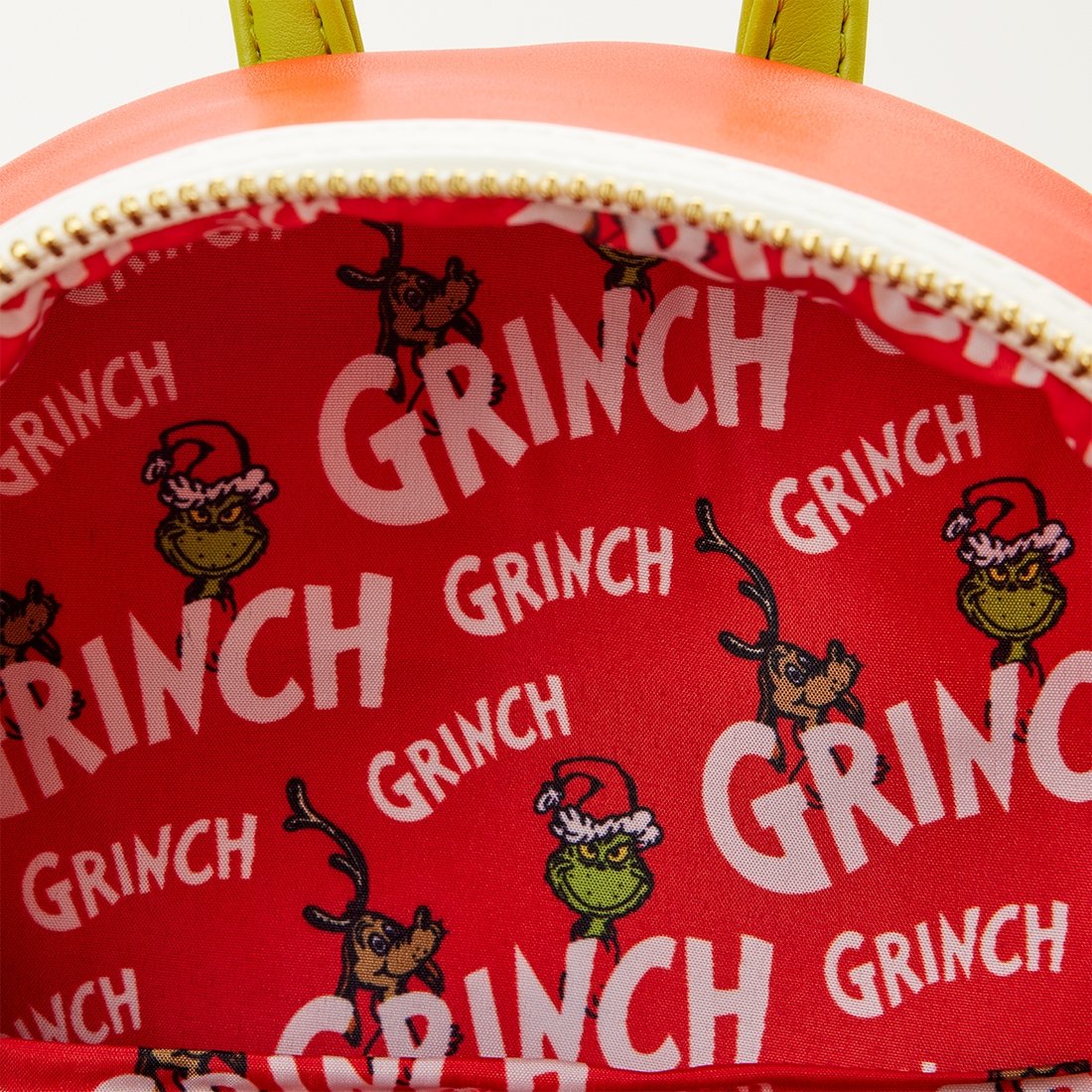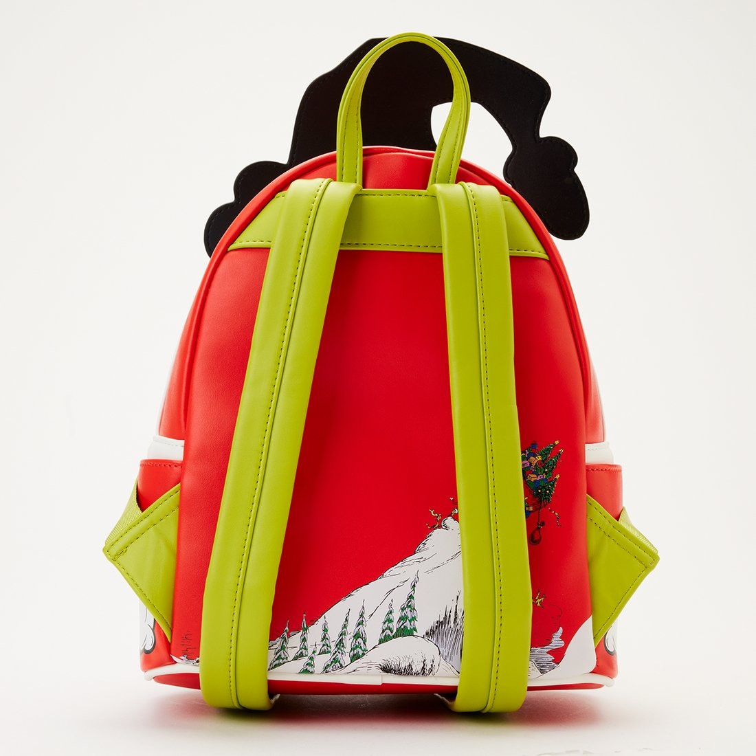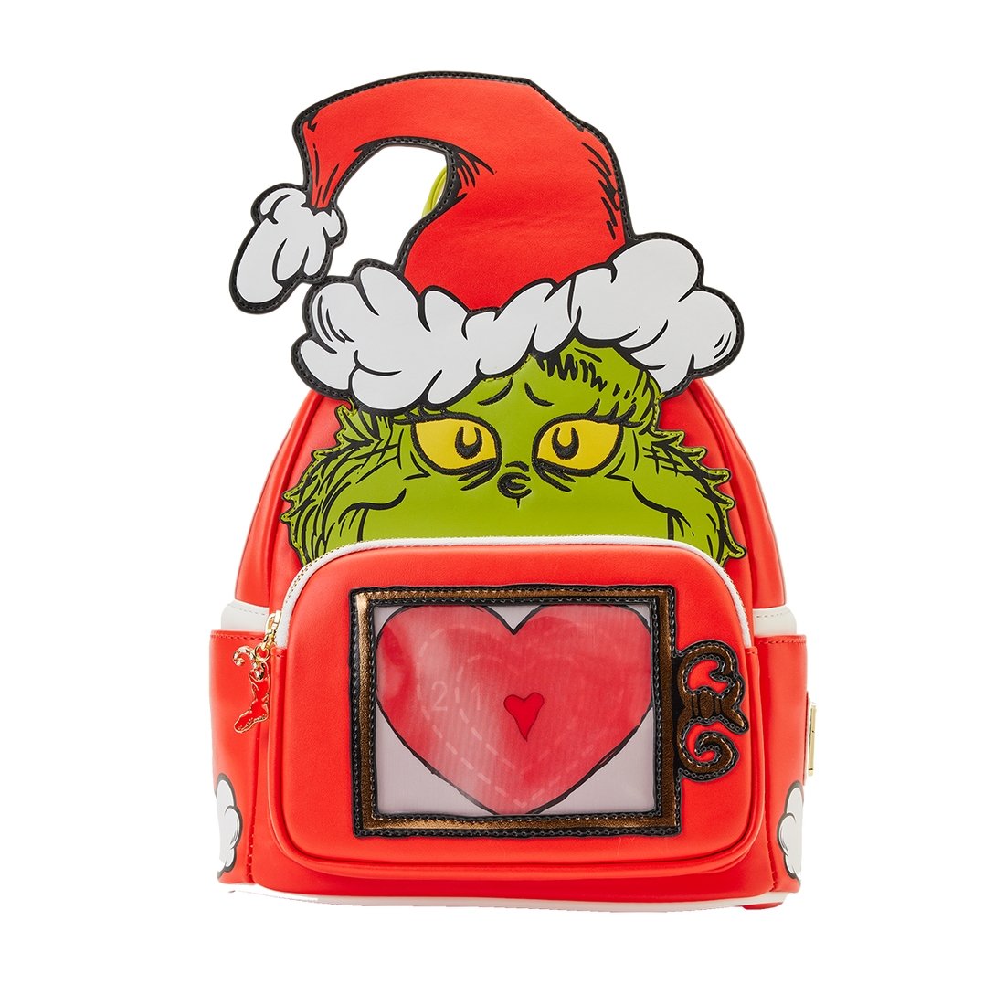 This grouchy green grump has discovered the true meaning of Christmas, and it’s thawed his icy heart! The Loungefly Grinch Lenticular Heart Mini Backpack shows the Grinch in a homemade cap to disguise himself as Saint Nick. Tilting the bag in the light will reveal the Grinch’s small heart, which grows three sizes larger with lenticular details! An enamel zipper charm of a holiday stocking adds some extra festive flair. On the back of the bag, the Grinch uses the strength of ten Grinches (plus two) to stop his overloaded sleigh from tumbling down Mount Crumpit. This heartwarming accessory adds a touch of nostalgia to any outfit and will keep your treasures safe as you welcome Christmas hand in hand. The Loungefly Grinch Lenticular Heart Mini Backpack is made of vegan leather (polyurethane). Bag has adjustable shoulder straps and sturdy metal hardware. Additional features include applique, debossed, embroidered, lenticular, and printed details. Take note of the coordinating inside lining. This bag is an officially licensed Dr. Seuss™ product. Backpack dimensions: 24.1cmW x 25.4cmH x 11.4cmD (Please note: width is measured across the bottom of the backpack.)