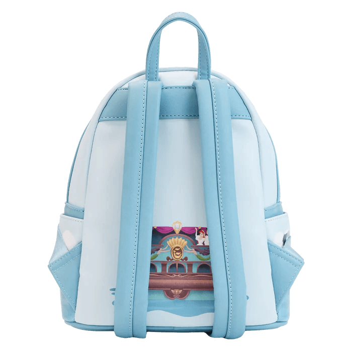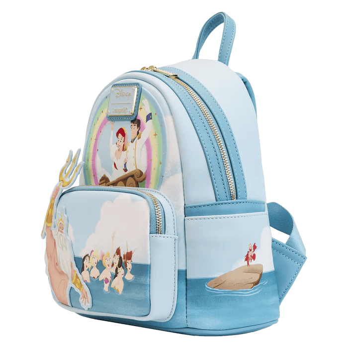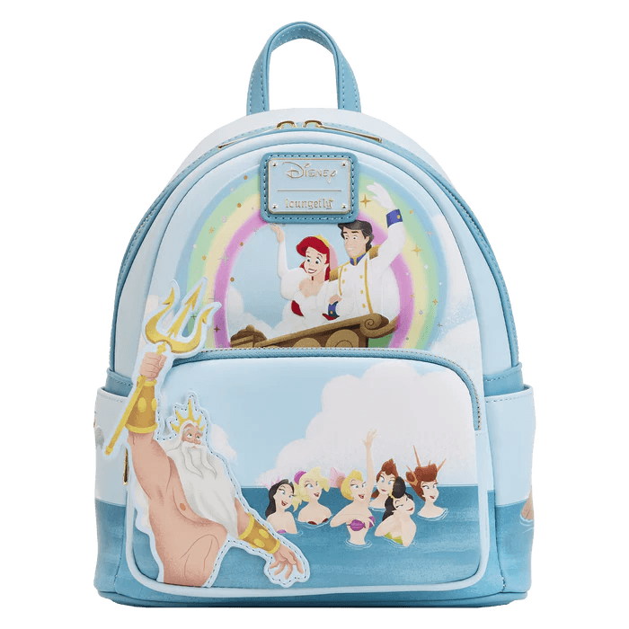 Your happy ending begins! Join the celebration with the Loungefly Little Mermaid Triton’s Gift Mini Backpack. On the front, King Triton and his daughters attend a royal wedding. Up above, Princess Ariel and Prince Eric wave from a ship as a rainbow forms around them. Turn the bag around to see Ariel’s seafaring friends appear on the side pockets, while the newlyweds make an encore appearance on the back. This oceanic accessory is sure to make waves with any outfit and will keep your gadgets and gizmos safe on any journey.