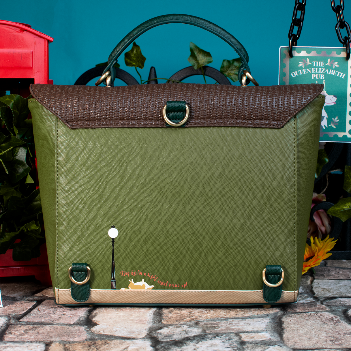 What are you having? The Queen Elizabeth Pub Classic Backpack? Excellent choice! This vegan leather bag can be worn as a backpack, shoulder bag, or crossbody, thanks to the detachable straps provided. It has a spacious main compartment and pockets to hold all your essentials, including a matching coin purse and phone case if you’re going for the complete Queen Elizabeth Pub look. Speaking of which, check out the intricate artwork on this backpack, especially the thatched roof, hand-stitched details, and those intriguing doors.