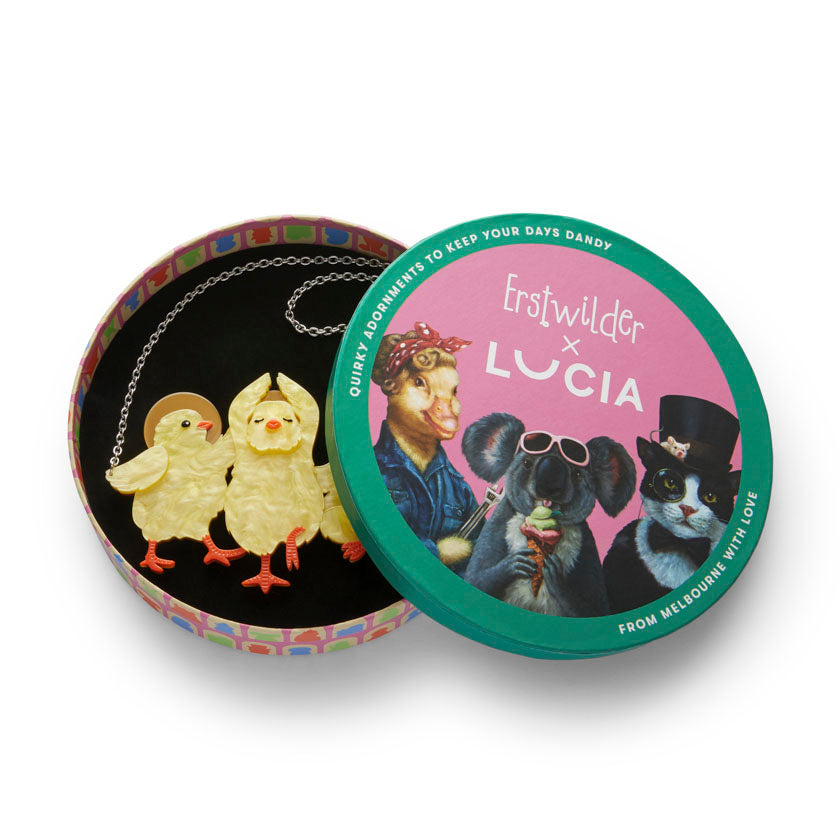 Care: Please be aware that resin is akin to ceramic and glass and therefore may be damaged if dropped or knocked. Due to the use of high quality silver-plating in our brooch clasps, tarnishing and oxidisation can occur, producing black and gold discolouration. As with all silver products, you can simply restore it using a silver cloth. Keep your Erstwilder companion neatly tucked away in this box when not being worn, avoid contact with perfumes, lotions, water and excessive sunlight and you’ll have a trusted friend for years to come.