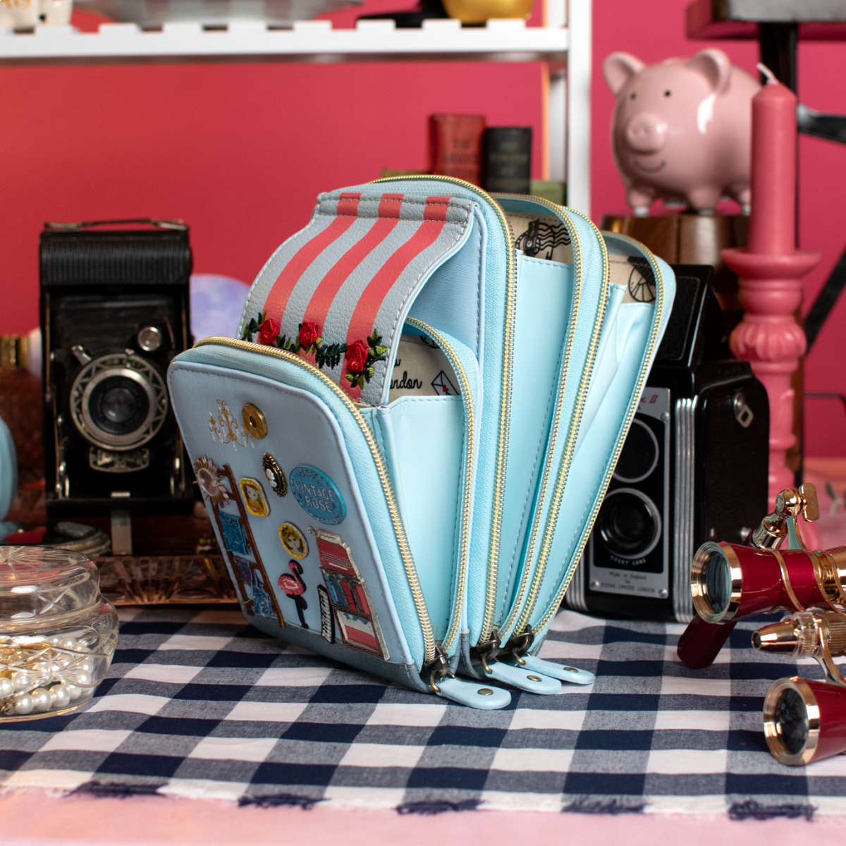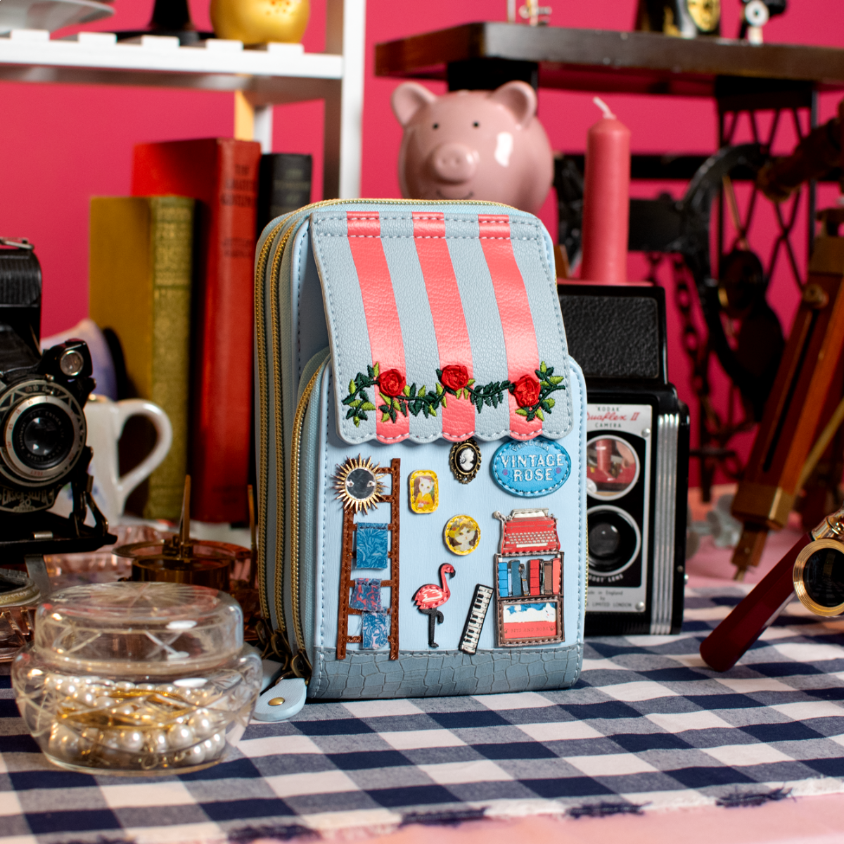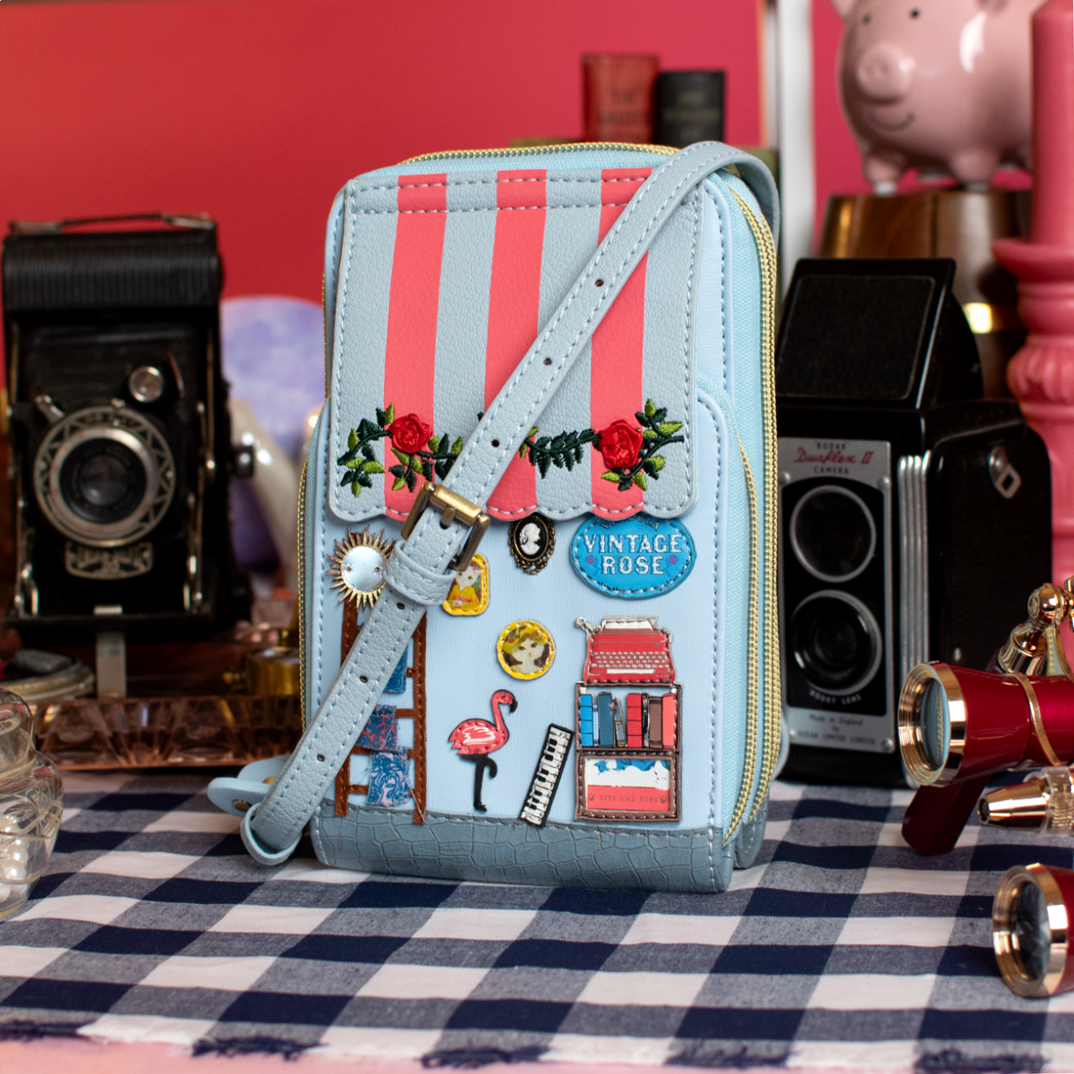 The Vendula Vintage Rose Callaway Bag is a small but mighty accessory! Beneath its flap closure, you’ll find three zip compartments for all your essentials and a few cards. Carry it as a pouch or wear it over the shoulder/crossbody by attaching the strap. Made from vegan leather, it features impressive artwork, including cat portraits, a bookshelf, a pink typewriter, and a whimsical flamingo.
