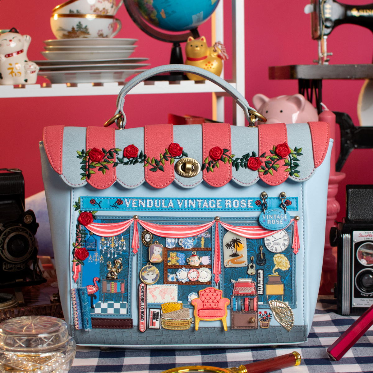 We’re bringing back an iconic bag shape! Get ready for the Vendula Vintage Rose Classic Backpack. This vegan leather accessory holds all your essentials in a spacious main compartment, with a secure flap clasp closure to keep everything safe. It has a comfortable handle and two detachable straps, so you can carry it as a handbag, over the shoulder, or crossbody. This blue backpack features charming artwork, including hand-stitched roses on the awning and a shopfront full of vintage treasures.