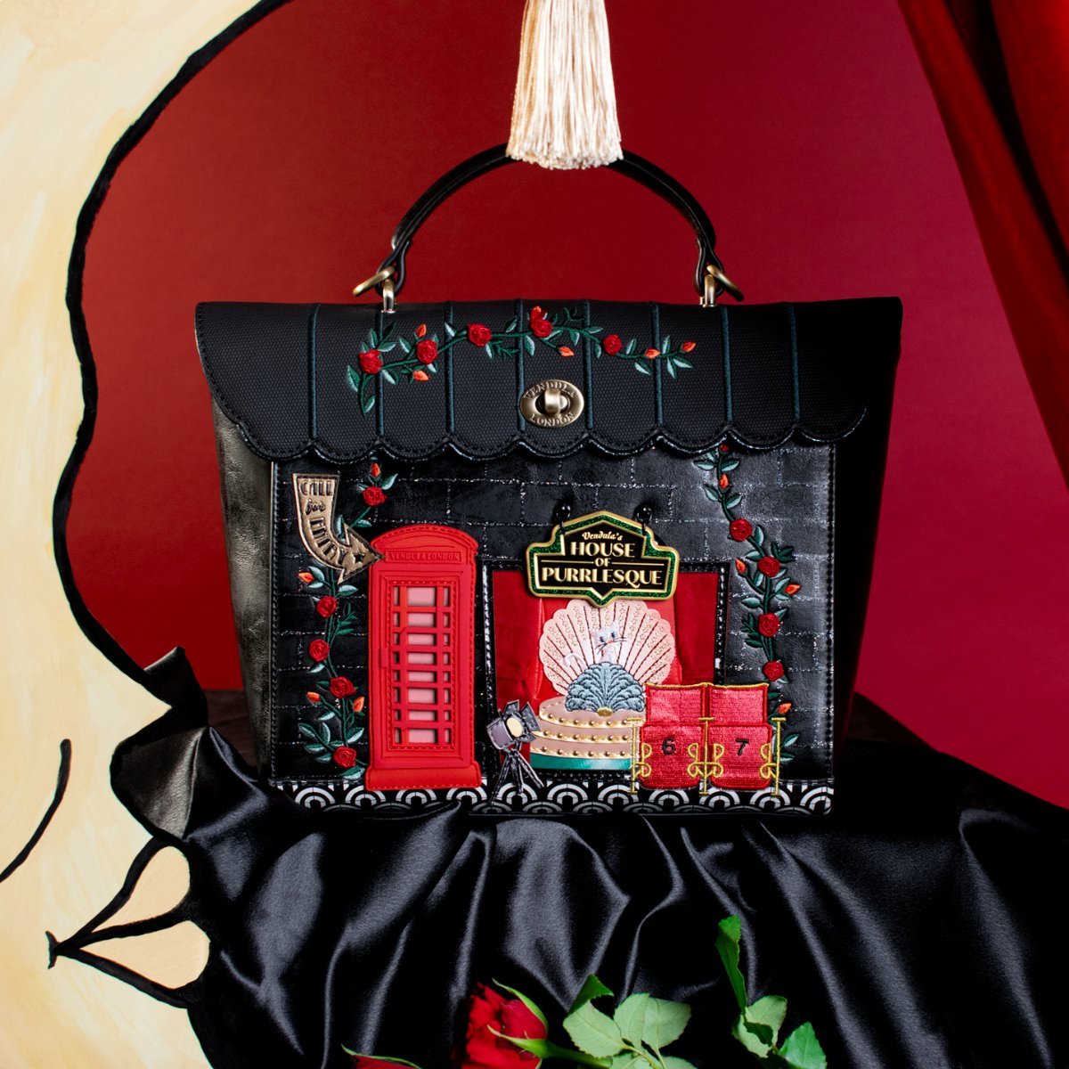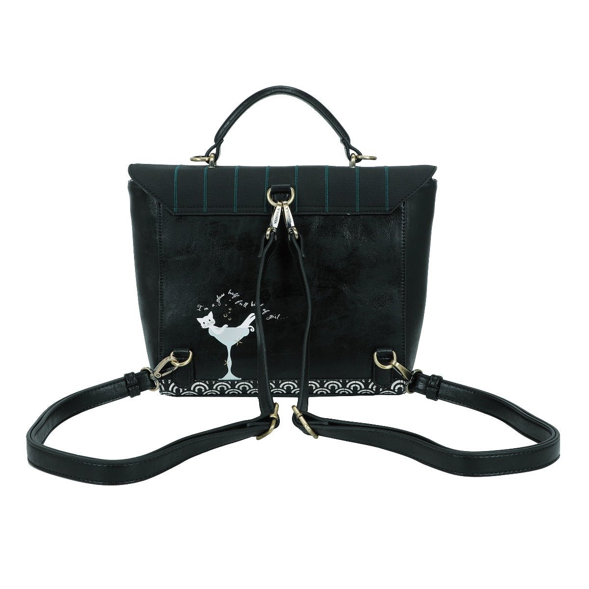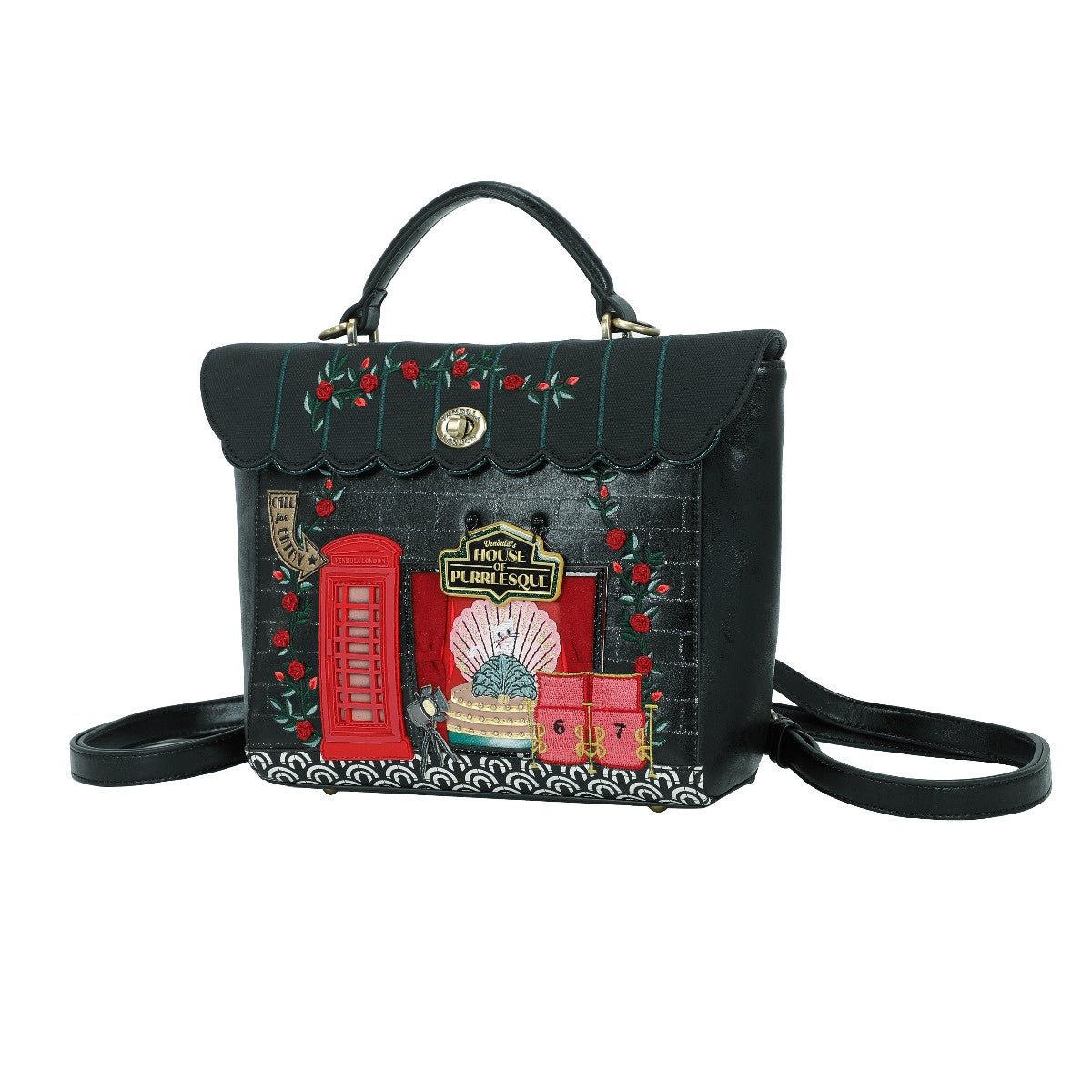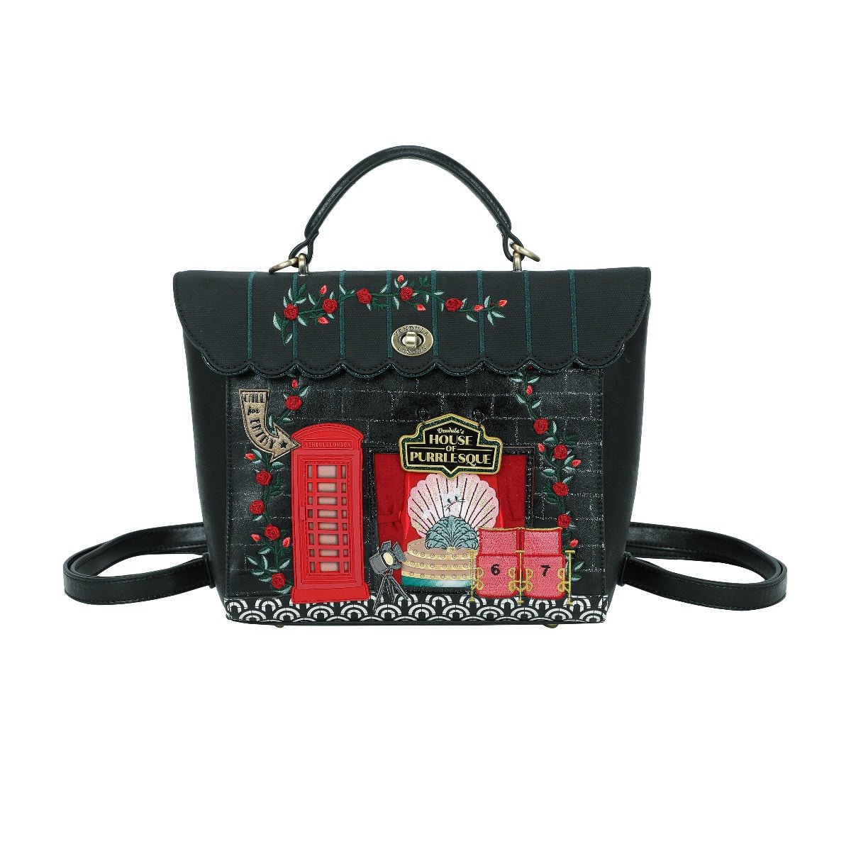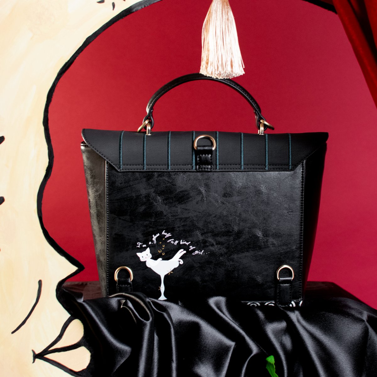 The Vendula's Purrlesque Club Backpack is a real treasure! Naturally, it boasts a compartment big enough to fit in all you need daily. It comes with a handle and two adjustable straps which can be clipped on or off in order to turn the backpack into a handbag, shoulder or crossbody bag. This vegan leather bag comes in black with the most astonishing artwork made of colourful 3D details such as the pearl of the Purrlesque Club, Ms Cat-Nip herself, posing in a sumptuous décor that will blow you and your loved ones away. How about adding a matching wallet, purse or phone case to complete your look?