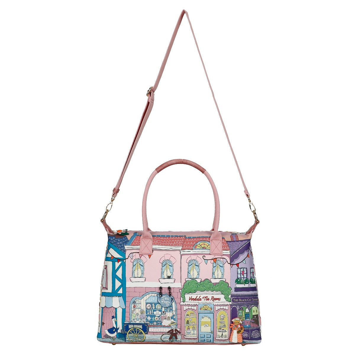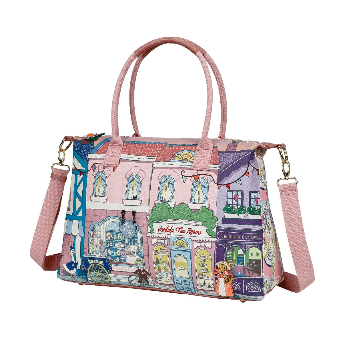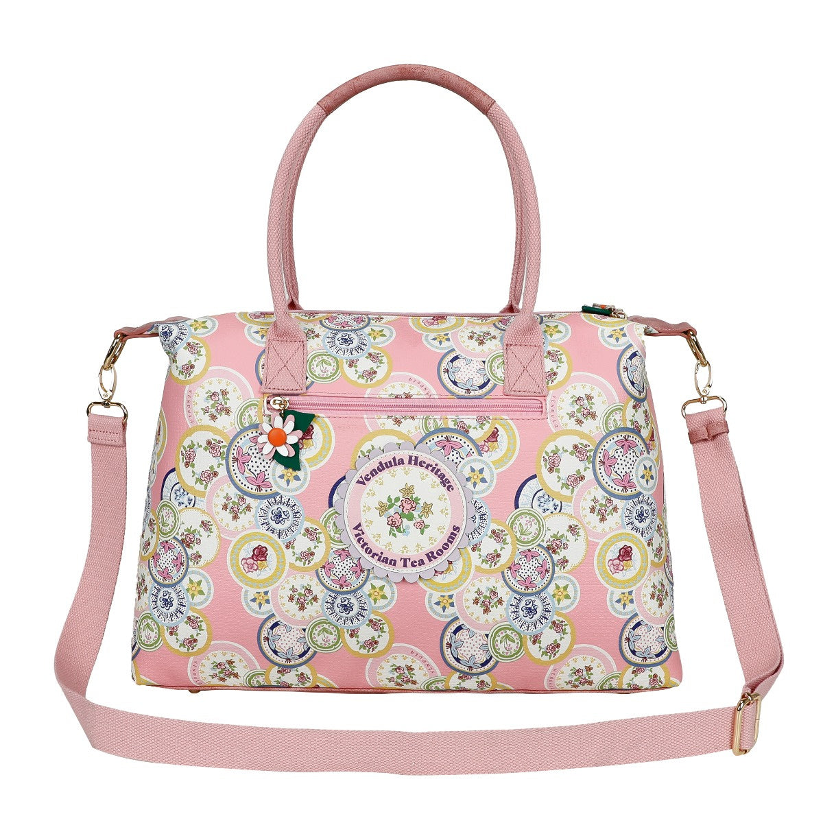 The first bag from this collection, the Vendula Heritage - Victorian Tea Rooms Bonnie Weekender, is large and spacious enough to fit everything you need for daily use or a few days away. It features two large, comfortable handles and a detachable strap, allowing you to carry it over the shoulder or crossbody, depending on the bag’s weight. Made of vegan leather, this stunning bag is adorned with a Victorian-era street print at the front, a colourful plate pattern at the back, along with 3D details, flower-shaped zip pullers, and an exclusive lining.