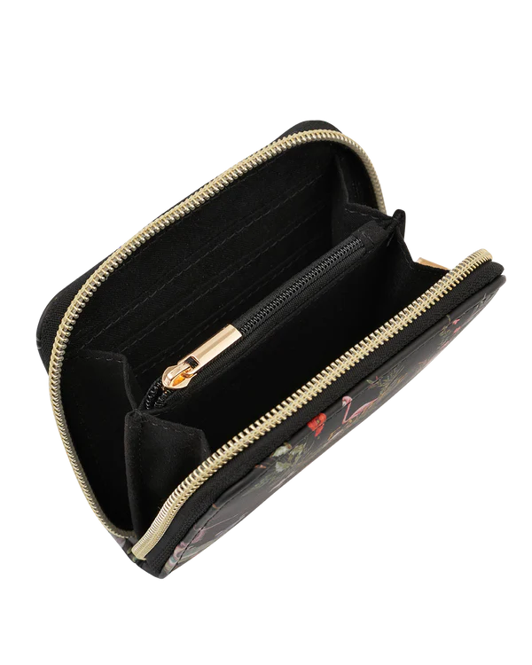 Escape to Wonderland any day of the week with this ornate purse. Crafted from alternative leather adorned with fantastical foliage, curious birds and creatures, the piece features a soft velvet interior with compartments for coins and cards.